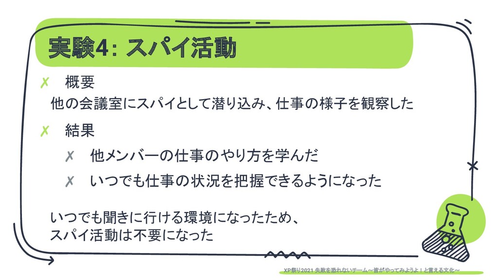 XP祭り2021 失敗を恐れないチーム〜皆がやってみようよ!と言える文化〜 スパイ活動 実験4