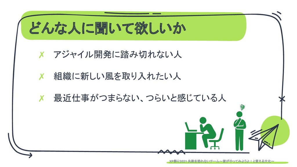 XP祭り2021 失敗を恐れないチーム〜皆がやってみようよ!と言える文化〜 どんな人に聞いて欲しいか ✗ アジャイル開発に踏み切れない人 ✗ 組織に新しい風を取り入れたい人 ✗ 最近仕事がつまらない、つらいと感じている人