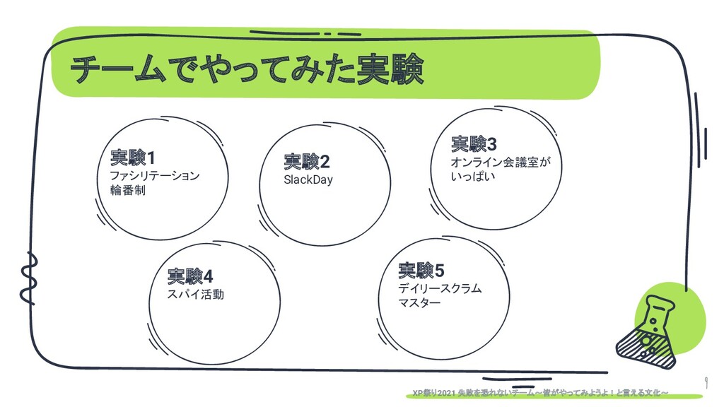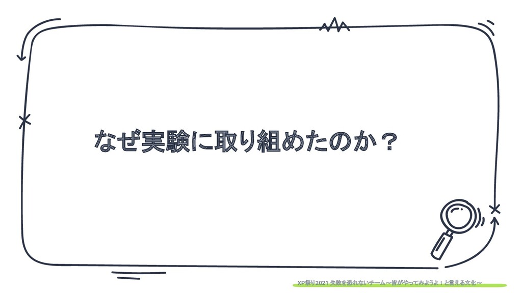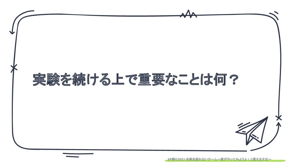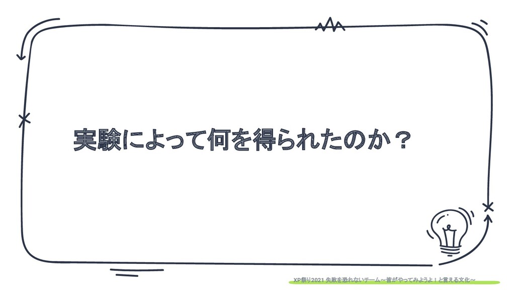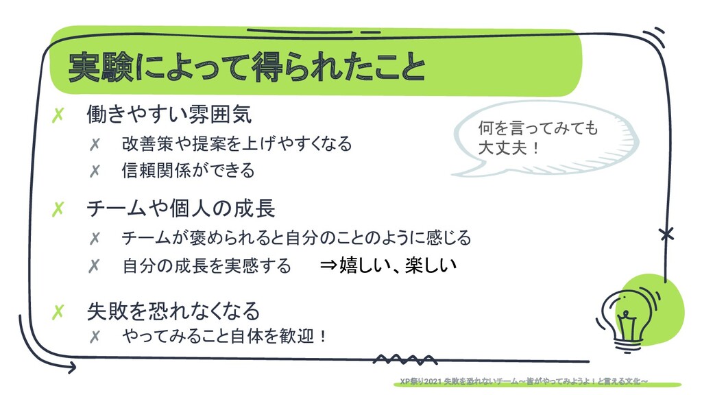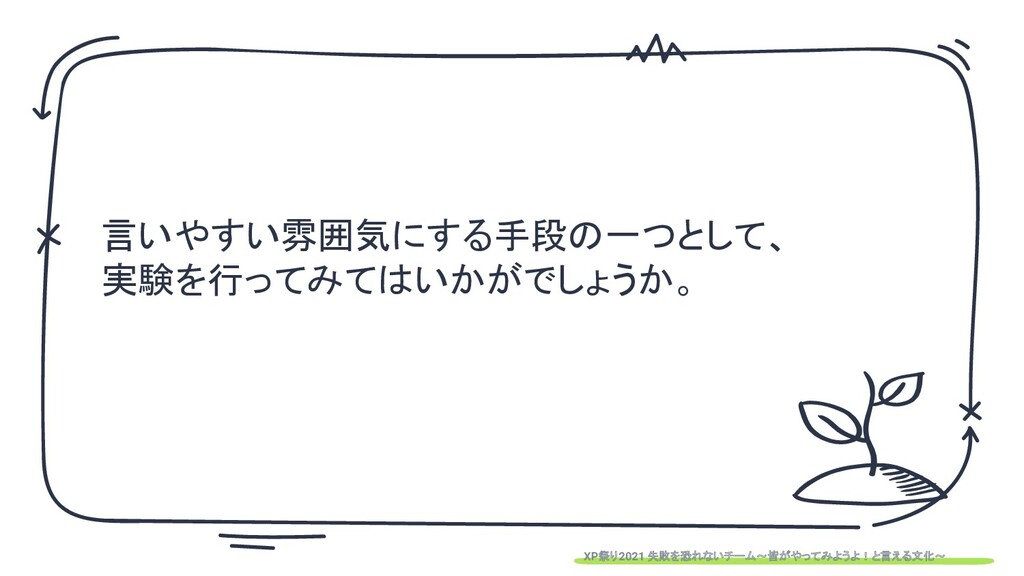 XP祭り2021 失敗を恐れないチーム〜皆がやってみようよ!と言える文化〜 言いやすい雰囲気にする手段の一つとして、 実験を行ってみてはいかがでしょうか。