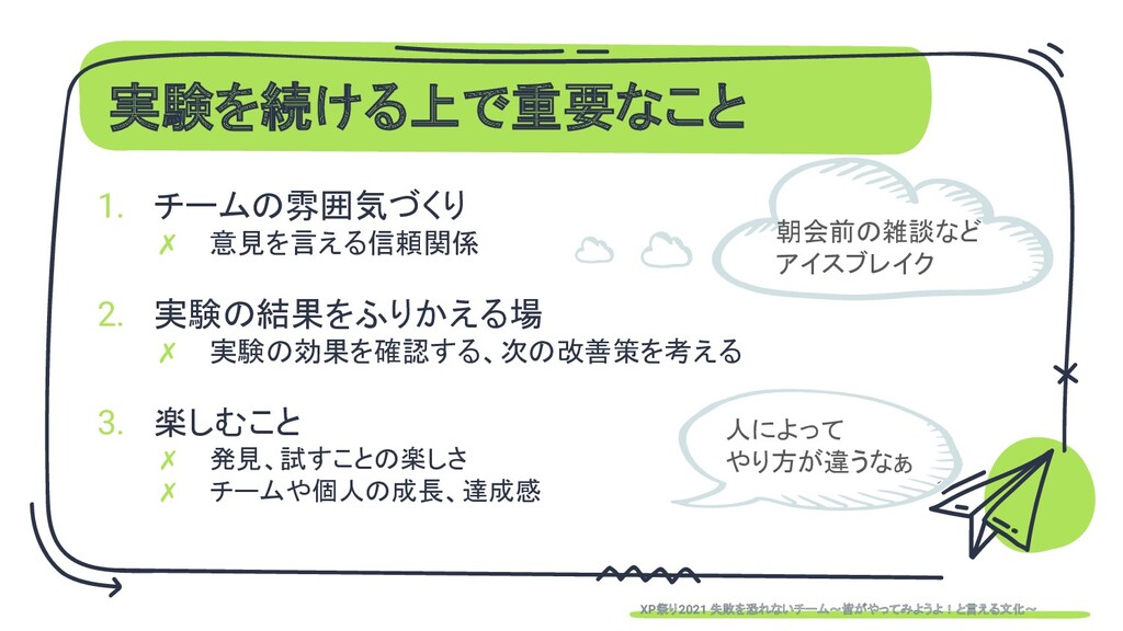 XP祭り2021 失敗を恐れないチーム〜皆がやってみようよ!と言える文化〜 実験を続ける上で重要なこと 1. チームの雰囲気づくり ✗ 意見を言える信頼関係 2. 実験の結果をふりかえる場 ✗