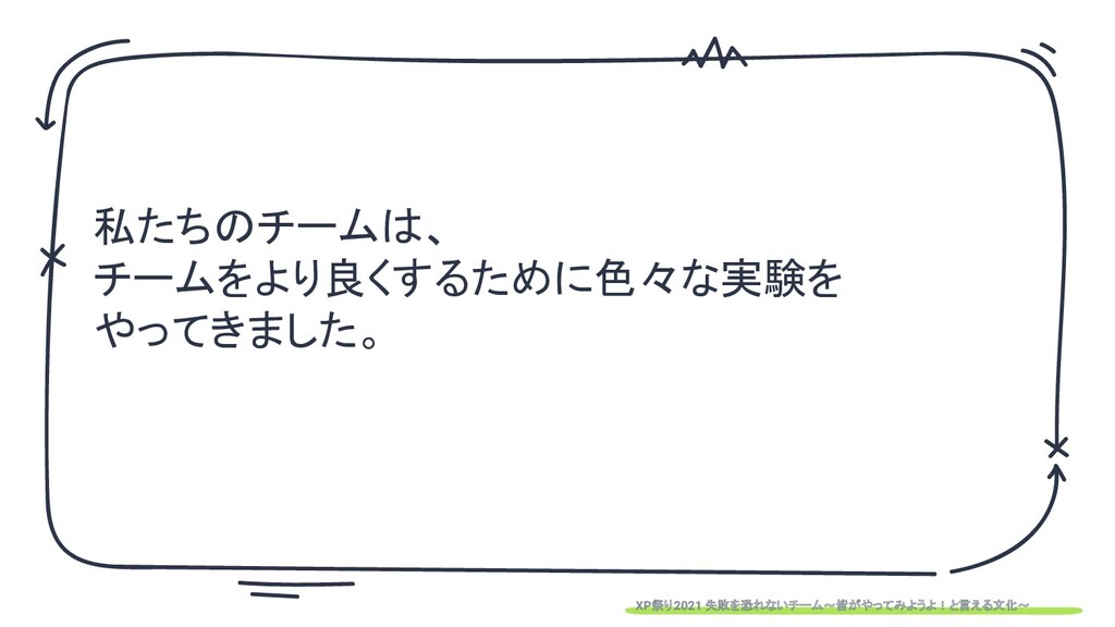 XP祭り2021 失敗を恐れないチーム〜皆がやってみようよ!と言える文化〜 私たちのチームは、 チームをより良くするために色々な実験を やってきました。