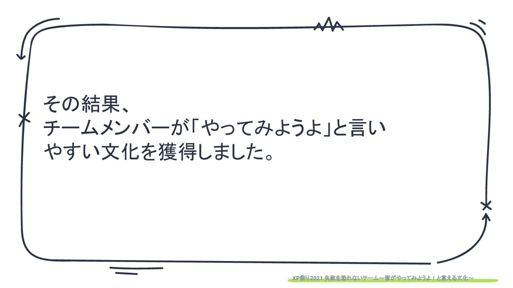 XP祭り2021 失敗を恐れないチーム〜皆がやってみようよ!と言える文化〜 その結果、 チームメンバーが「やってみようよ」と言い やすい文化を獲得しました。