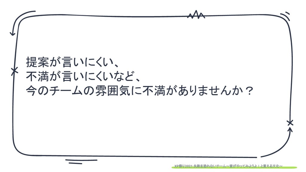 XP祭り2021 失敗を恐れないチーム〜皆がやってみようよ!と言える文化〜 提案が言いにくい、 不満が言いにくいなど、 今のチームの雰囲気に不満がありませんか?