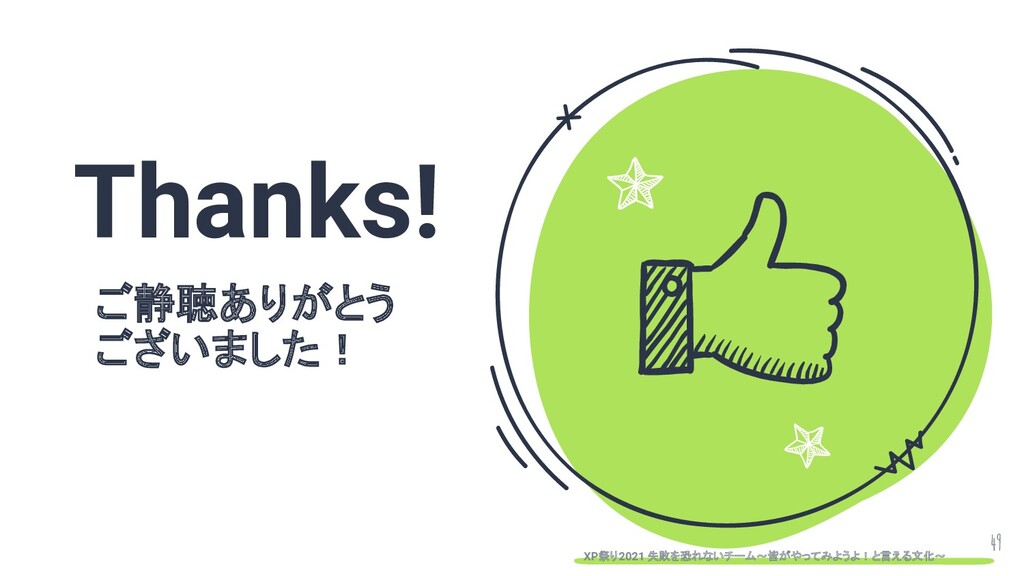 XP祭り2021 失敗を恐れないチーム〜皆がやってみようよ!と言える文化〜 Thanks! 49 ご静聴ありがとう ございました!