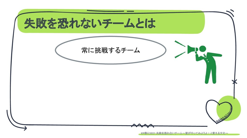XP祭り2021 失敗を恐れないチーム〜皆がやってみようよ!と言える文化〜 失敗を恐れないチームとは 常に挑戦するチーム