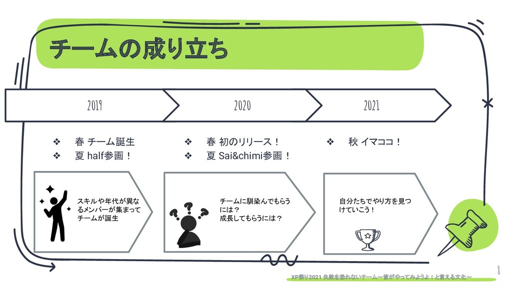 XP祭り2021 失敗を恐れないチーム〜皆がやってみようよ!と言える文化〜 チームの成り立ち 8 2021 ❖ 秋 イマココ! 2019 ❖