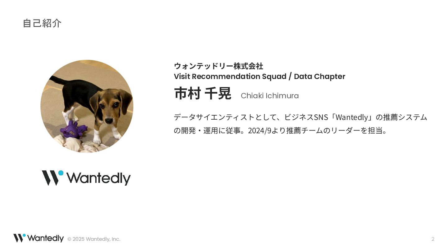 © 2025 Wantedly, Inc. 市村 千晃 Chiaki Ichimura データサイエンティストとして、ビジネスSNS「Wantedly」の推薦システム の開発‧運⽤に従事。2024/9より推薦チームのリーダーを担当。