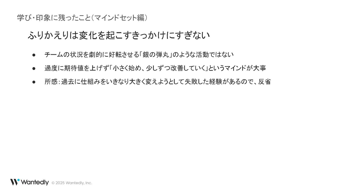 © 2025 Wantedly, Inc. 学び・印象に残ったこと(マインドセット編) ふりかえりは変化を起こすきっかけにすぎない • チームの状況を劇的に好転させる「銀の弾丸」のような活動ではない • 過度に期待値を上げず「小さく始め、少しずつ改善していく」というマインドが大事