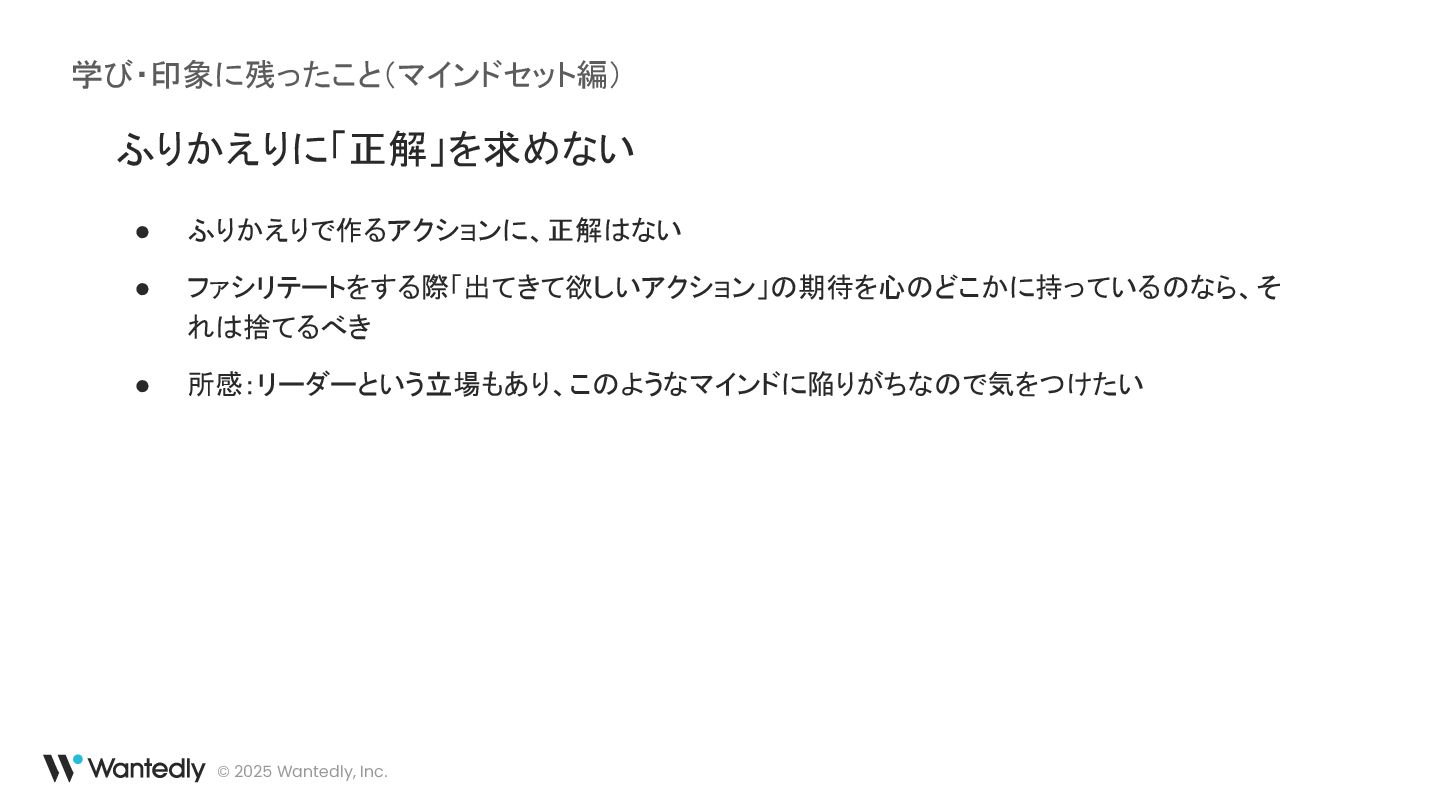 © 2025 Wantedly, Inc. 学び・印象に残ったこと(マインドセット編) ふりかえりに「正解」を求めない • ふりかえりで作るアクションに、正解はない • ファシリテートをする際「出てきて欲しいアクション」の期待を心のどこかに持っているのなら、そ