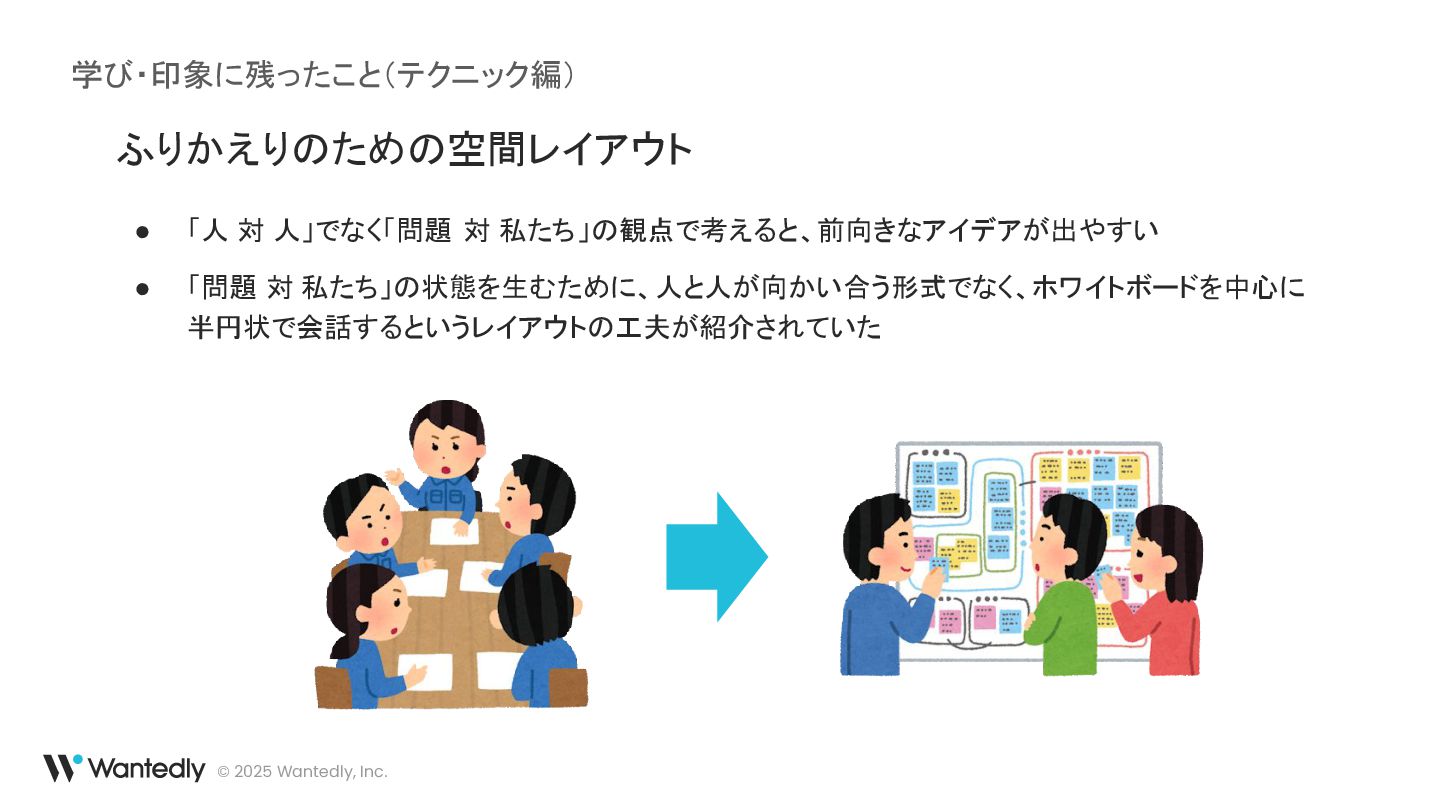 © 2025 Wantedly, Inc. 学び・印象に残ったこと(テクニック編) ふりかえりのための空間レイアウト • 「人 対 人」でなく「問題