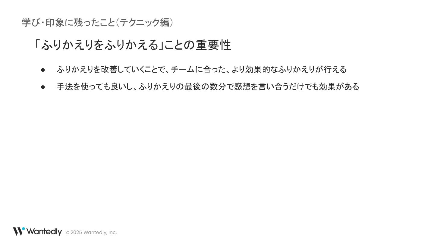 © 2025 Wantedly, Inc. 学び・印象に残ったこと(テクニック編) 「ふりかえりをふりかえる」ことの重要性 • ふりかえりを改善していくことで、チームに合った、より効果的なふりかえりが行える • 手法を使っても良いし、ふりかえりの最後の数分で感想を言い合うだけでも効果がある