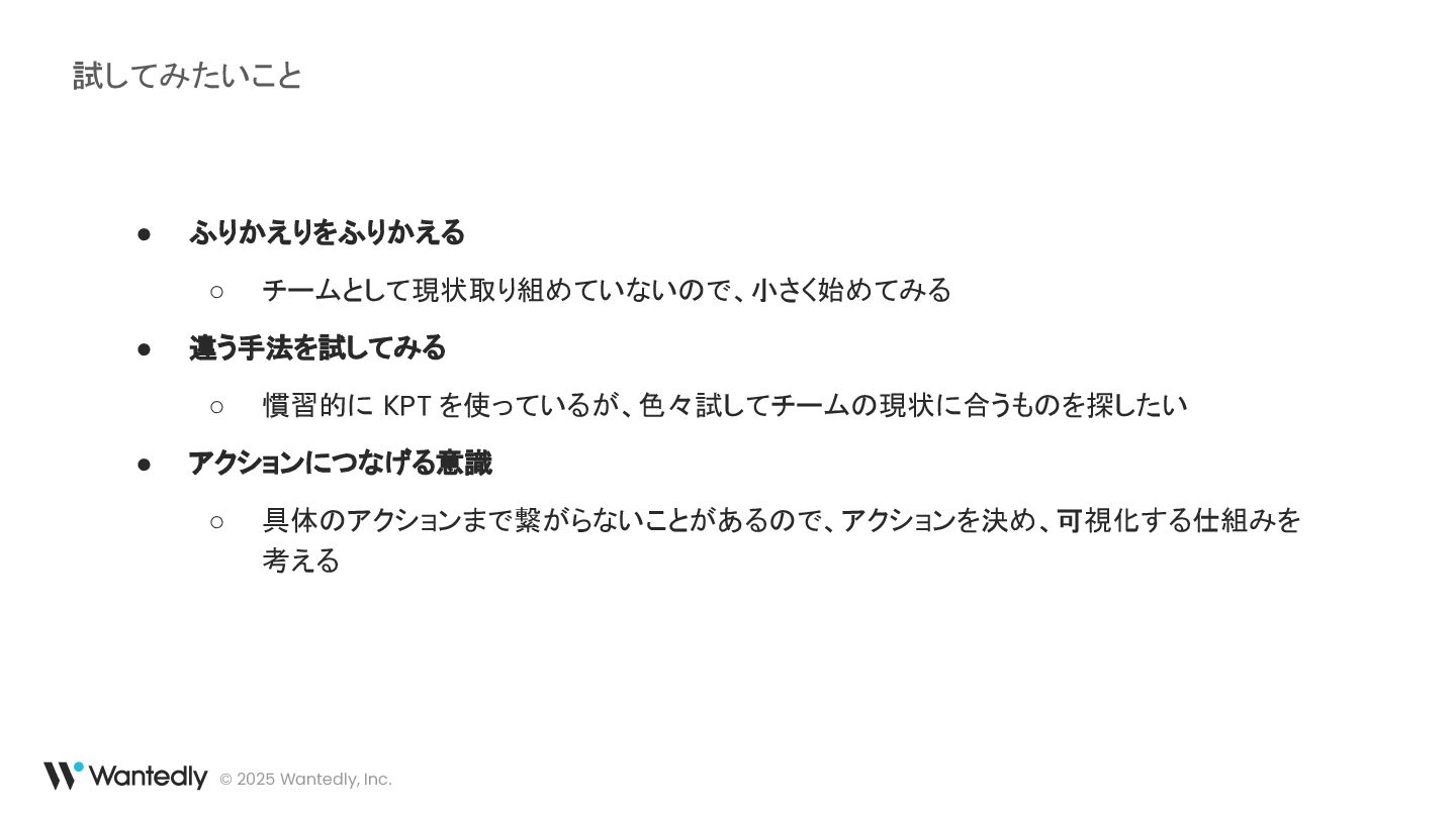 © 2025 Wantedly, Inc. 試してみたいこと • ふりかえりをふりかえる ◦ チームとして現状取り組めていないので、小さく始めてみる •