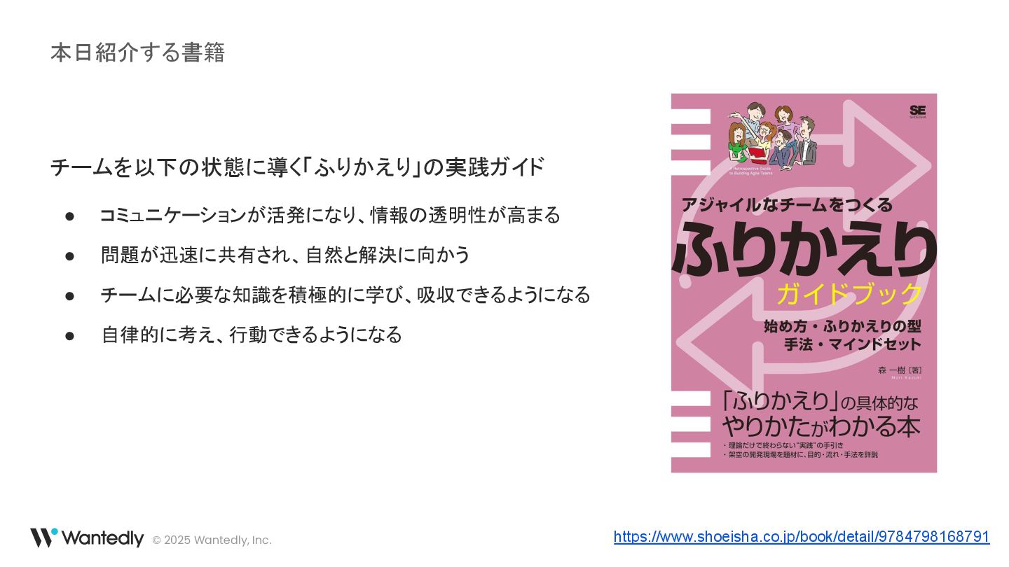 © 2025 Wantedly, Inc. 書籍紹介:アジャイルなチームをつくる ふり かえりガイドブック 読書シェア会 vol.9 Sep.30