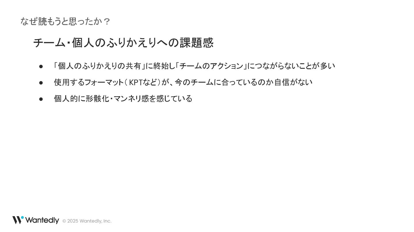 © 2025 Wantedly, Inc. なぜ読もうと思ったか? チーム・個人のふりかえりへの課題感 • 「個人のふりかえりの共有」に終始し「チームのアクション」につながらないことが多い • 使用するフォーマット(