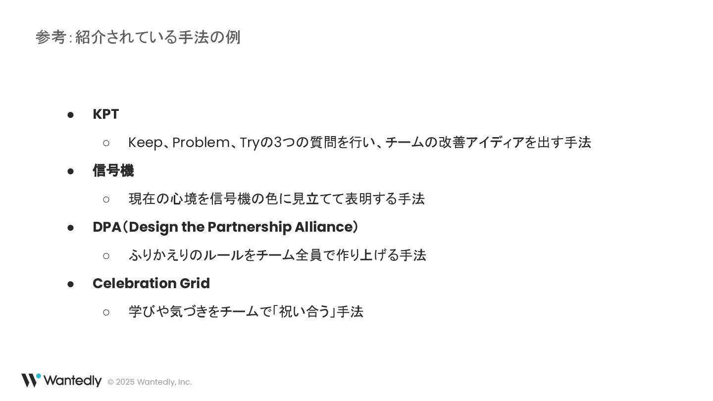 © 2025 Wantedly, Inc. 参考:紹介されている手法の例 • KPT ◦ Keep、Problem、Tryの3つの質問を行い、チームの改善アイディアを出す手法 •
