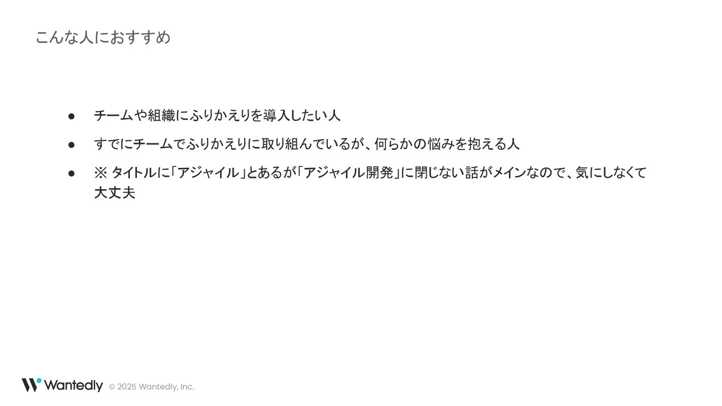 © 2025 Wantedly, Inc. • チームや組織にふりかえりを導入したい人 • すでにチームでふりかえりに取り組んでいるが、何らかの悩みを抱える人 • ※