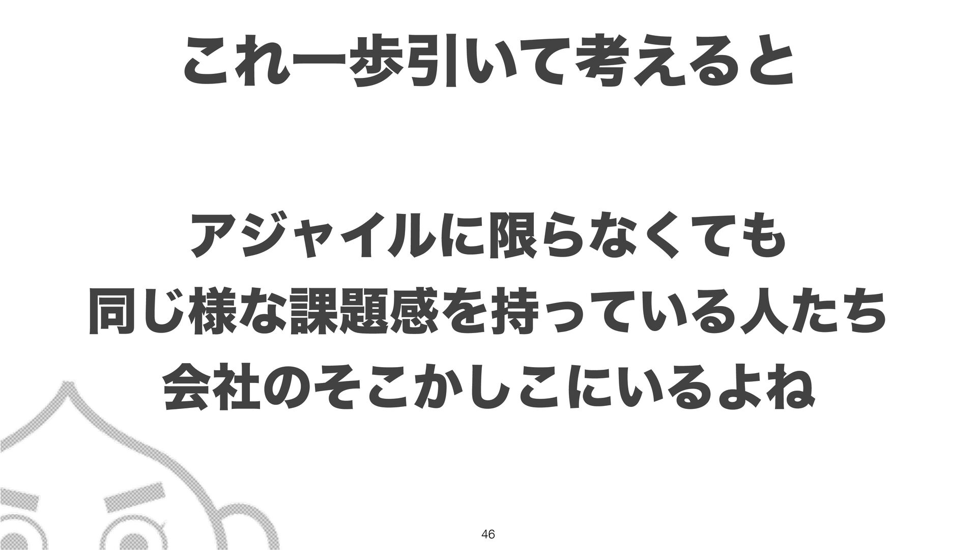 ͜ΕҰาҾ͍ͯߟ͑Δͱ ΞδϟΠϧʹݶΒͳͯ͘ ಉ༷͡ͳ՝ײΛ͍࣋ͬͯΔਓͨͪ ձࣾͷ͔ͦ͜͜͠ʹ͍ΔΑͶ  46