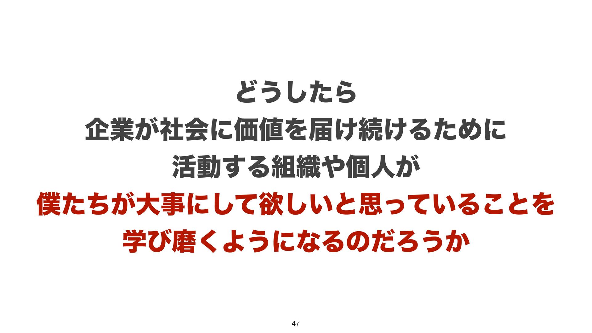 47 Ͳ͏ͨ͠Β اۀ͕ࣾձʹՁΛಧ͚ଓ͚ΔͨΊʹ ׆ಈ͢Δ৫ݸਓ͕ ͕ͨͪେࣄʹͯ͠ཉ͍͠ͱࢥ͍ͬͯΔ͜ͱΛ ֶͼຏ͘Α͏ʹͳΔͷͩΖ͏͔