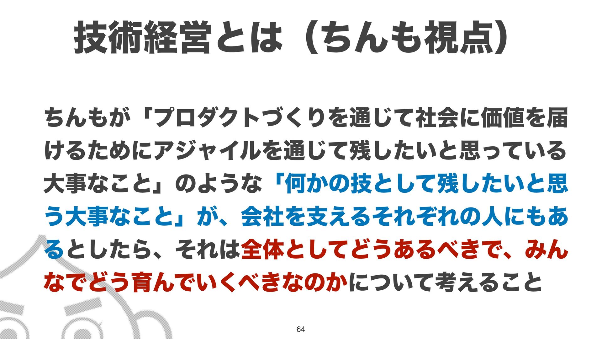 ٕज़ܦӦͱʢͪΜࢹʣ ͪΜ͕ʮϓϩμΫτͮ͘ΓΛ௨ͯࣾ͡ձʹՁΛಧ ͚ΔͨΊʹΞδϟΠϧΛ௨͍ͯͨ͡͠ͱࢥ͍ͬͯΔ େࣄͳ͜ͱʯͷΑ͏ͳʮԿ͔ͷٕͱ͍ͯͨ͠͠ͱࢥ ͏େࣄͳ͜ͱʯ͕ɺձࣾΛࢧ͑ΔͦΕͧΕͷਓʹ͋ Δͱͨ͠ΒɺͦΕશମͱͯ͠Ͳ͏͋Δ͖ͰɺΈΜ ͳͰͲ͏ҭΜͰ͍͖͘ͳͷ͔ʹ͍ͭͯߟ͑Δ͜ͱ  64