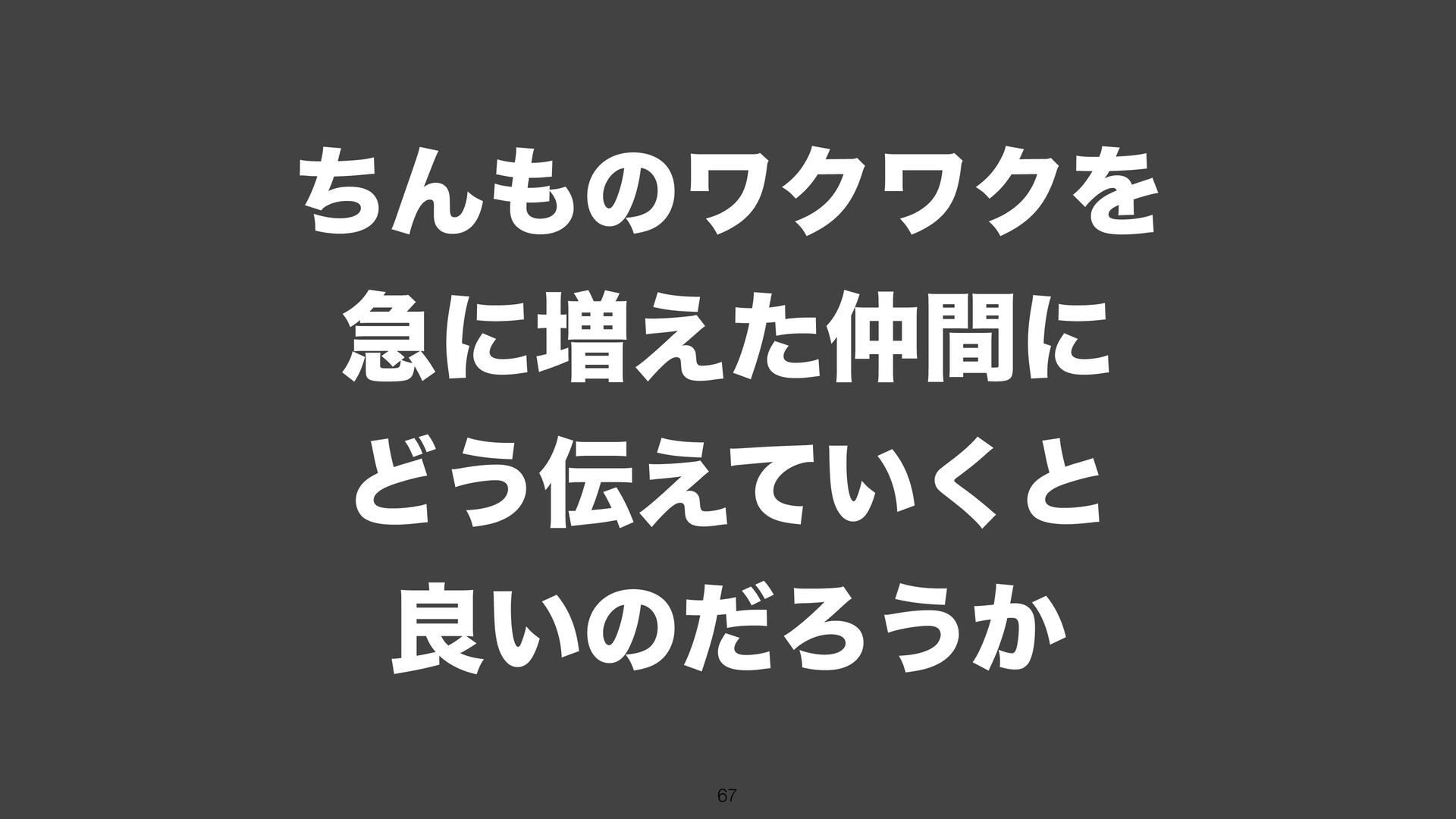 67 ͪΜͷϫΫϫΫΛ ٸʹ૿͑ͨؒʹ Ͳ͏͍͑ͯ͘ͱ ྑ͍ͷͩΖ͏͔