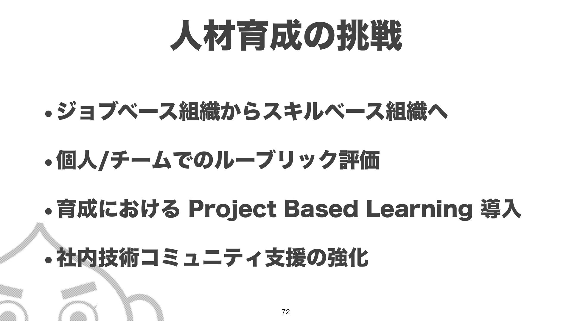 ਓࡐҭͷઓ wδϣϒϕʔε৫͔ΒεΩϧϕʔε৫ wݸਓνʔϜͰͷϧʔϒϦοΫධՁ wҭʹ͓͚Δ1SPKFDU#BTFE-FBSOJOHಋೖ wٕࣾज़ίϛϡχςΟࢧԉͷڧԽ  72