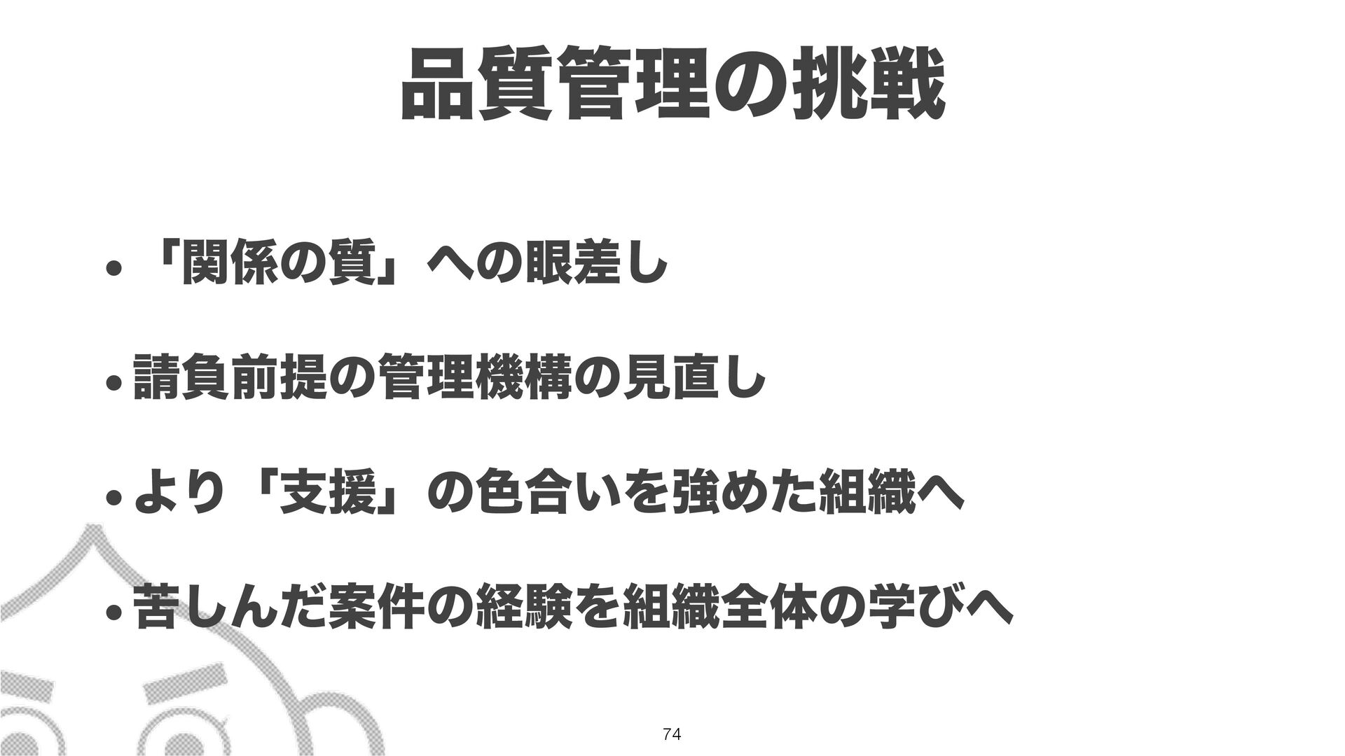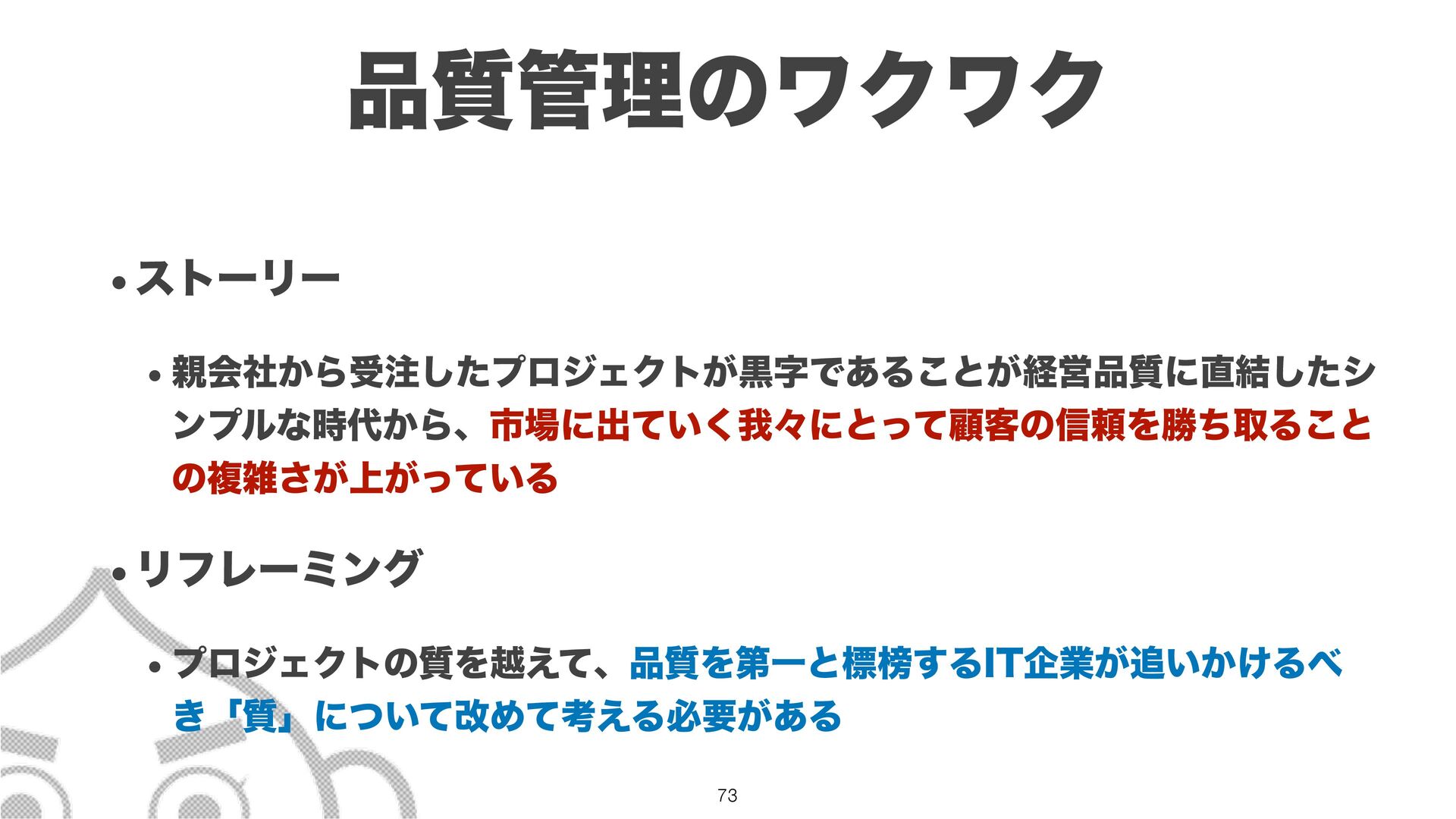 ࣭ཧͷϫΫϫΫ wετʔϦʔ wձ͔ࣾΒडͨ͠ϓϩδΣΫτ͕ࠇࣈͰ͋Δ͜ͱ͕ܦӦ࣭ʹ݁ͨ͠γ ϯϓϧͳ͔࣌Βɺࢢʹग़͍ͯ͘զʑʹͱͬͯސ٬ͷ৴པΛউͪऔΔ͜ͱ ͷෳࡶ্͕͕͍ͬͯ͞Δ wϦϑϨʔϛϯά wϓϩδΣΫτͷ࣭Λӽ͑ͯɺ࣭ΛୈҰͱඪᒗ͢Δ*5اۀ͕͍͔͚Δ ͖ʮ࣭ʯʹ͍ͭͯվΊͯߟ͑Δඞཁ͕͋Δ  73