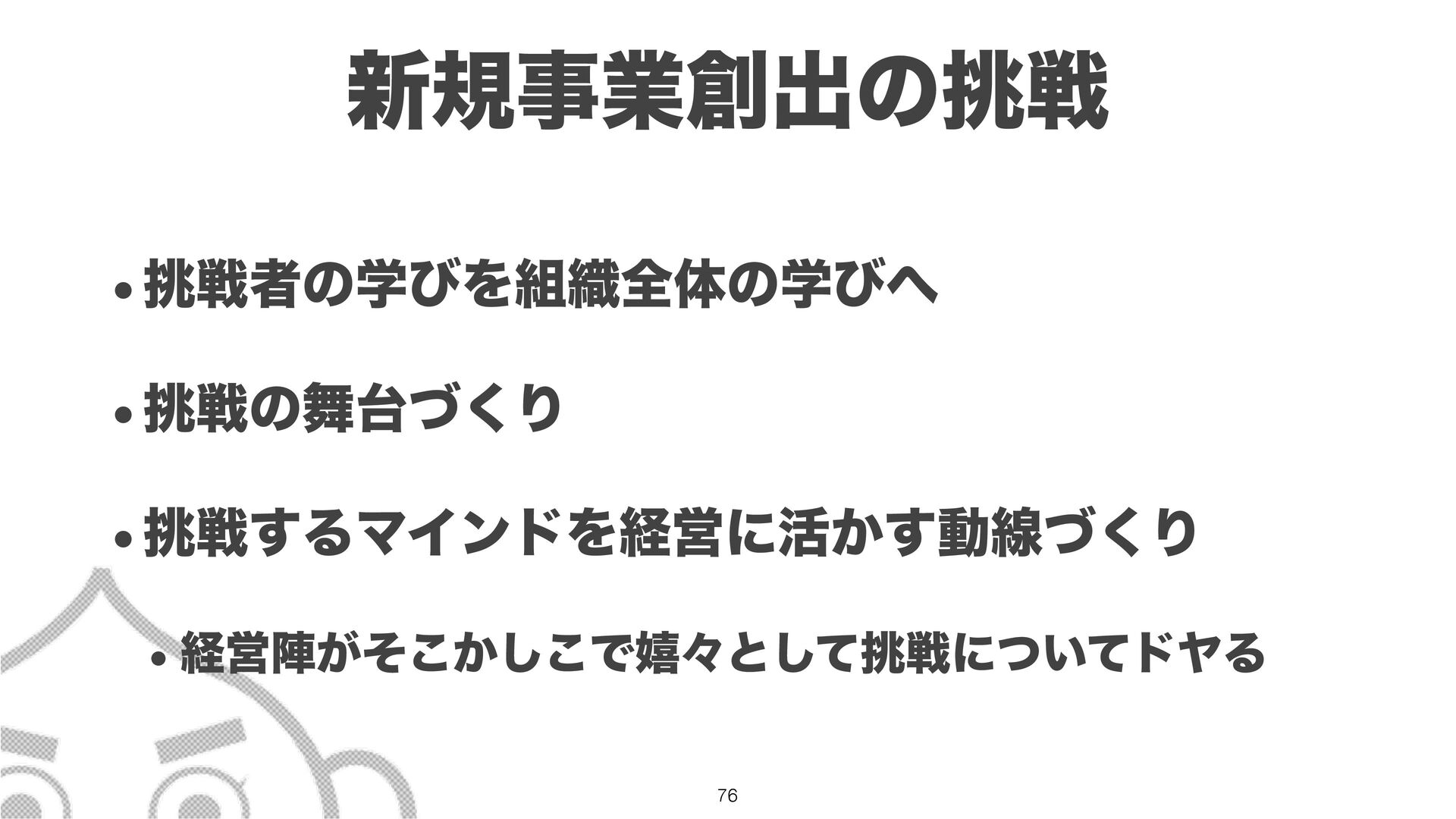 ৽نࣄۀग़ͷઓ wઓऀͷֶͼΛ৫શମͷֶͼ wઓͷͮ͘Γ wઓ͢ΔϚΠϯυΛܦӦʹ׆͔͢ಈઢͮ͘Γ wܦӦਞ͕͔ͦ͜͜͠Ͱخʑͱͯ͠ઓʹ͍ͭͯυϠΔ  76
