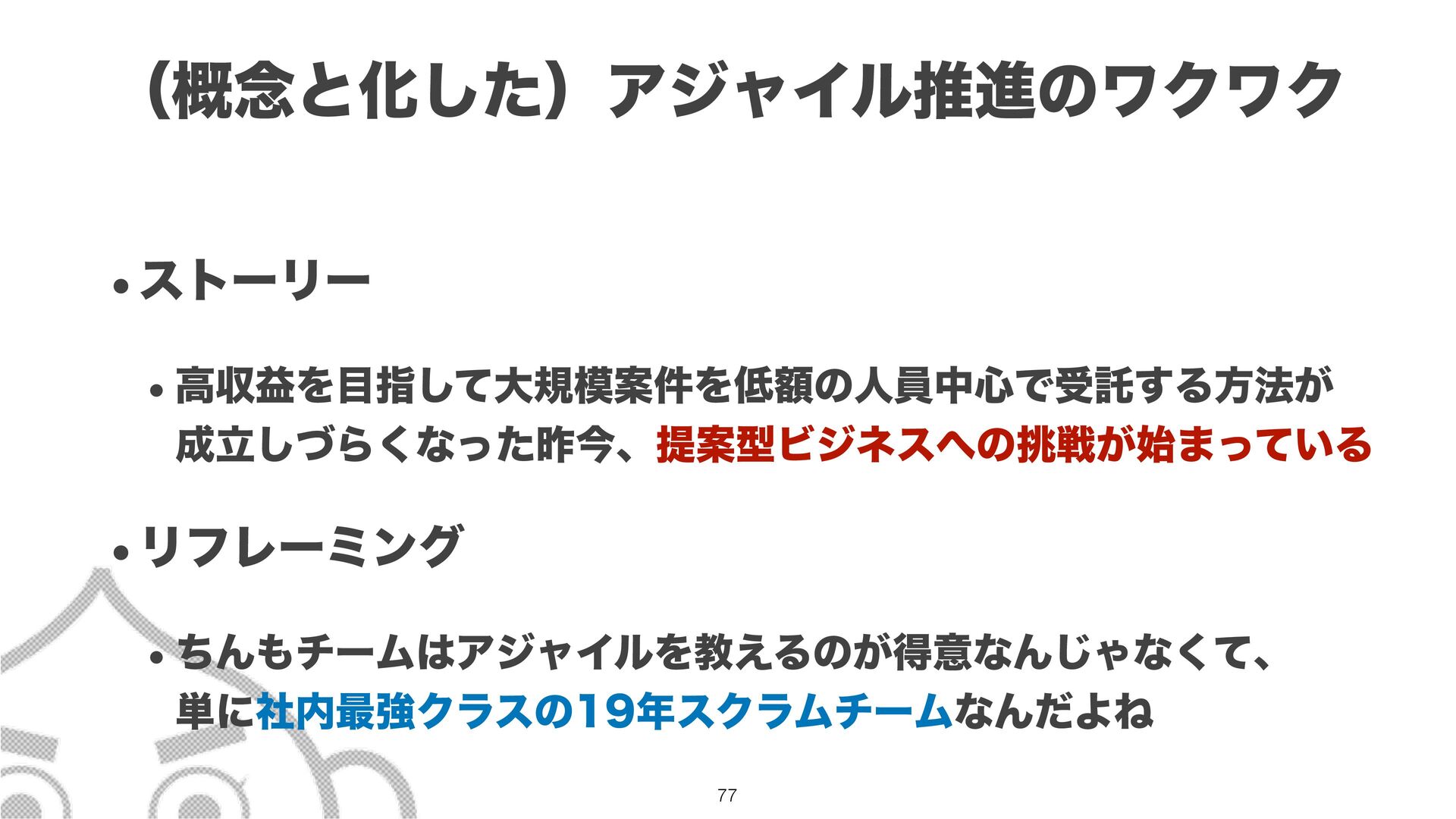 ʢ֓೦ͱԽͨ͠ʣΞδϟΠϧਪਐͷϫΫϫΫ wετʔϦʔ wߴऩӹΛࢦͯ͠େنҊ݅Λֹͷਓһத৺Ͱडୗ͢Δํ๏͕ ཱͮ͠Β͘ͳͬͨࡢࠓɺఏҊܕϏδωεͷઓ͕࢝·͍ͬͯΔ wϦϑϨʔϛϯά wͪΜνʔϜΞδϟΠϧΛڭ͑Δͷ͕ಘҙͳΜ͡Όͳͯ͘ɺ ୯ʹࣾ࠷ڧΫϥεͷεΫϥϜνʔϜͳΜͩΑͶ  77