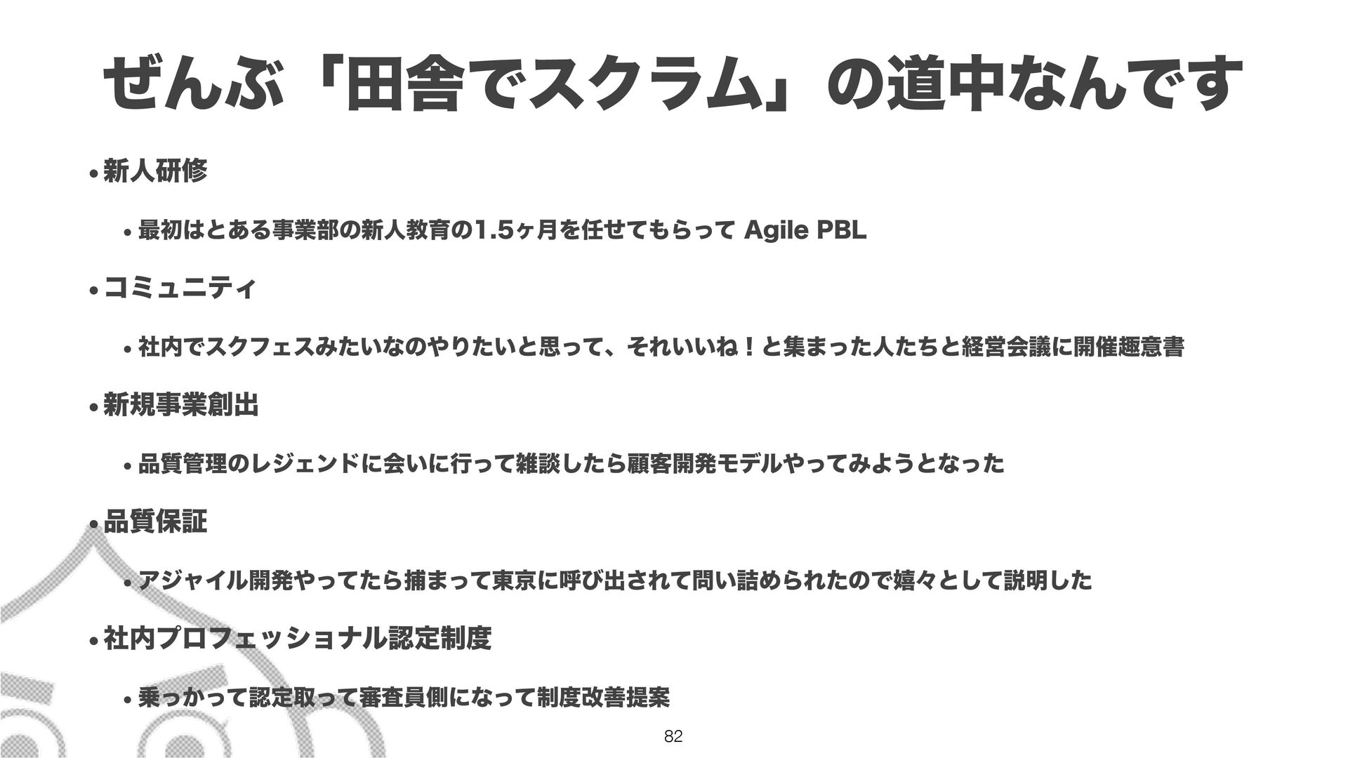 ͥΜͿʮాࣷͰεΫϥϜʯͷಓதͳΜͰ͢ w৽ਓݚम w࠷ॳͱ͋Δࣄۀ෦ͷ৽ਓڭҭͷϲ݄ΛͤͯΒͬͯ"HJMF1#- wίϛϡχςΟ wࣾͰεΫϑΣεΈ͍ͨͳͷΓ͍ͨͱࢥͬͯɺͦΕ͍͍Ͷʂͱू·ͬͨਓͨͪͱܦӦձٞʹ։࠵झҙॻ w৽نࣄۀग़ w࣭ཧͷϨδΣϯυʹձ͍ʹߦͬͯࡶஊͨ͠Βސ٬։ൃϞσϧͬͯΈΑ͏ͱͳͬͨ w࣭อূ wΞδϟΠϧ։ൃͬͯͨΒั·ͬͯ౦ژʹݺͼग़͞Ε͍ͯ٧ΊΒΕͨͷͰخʑͱͯ͠આ໌ͨ͠ wࣾϓϩϑΣογϣφϧೝఆ੍