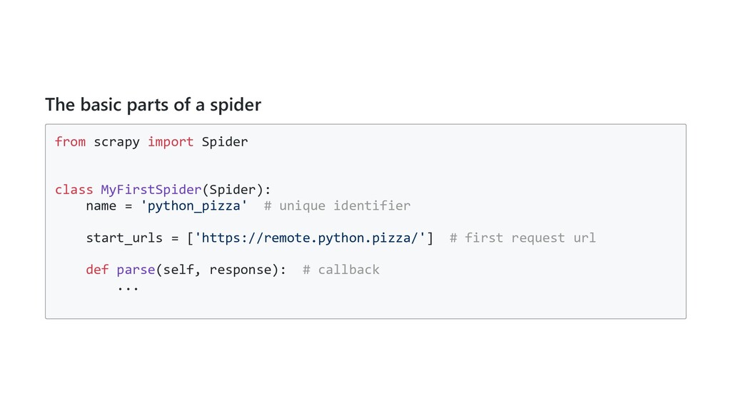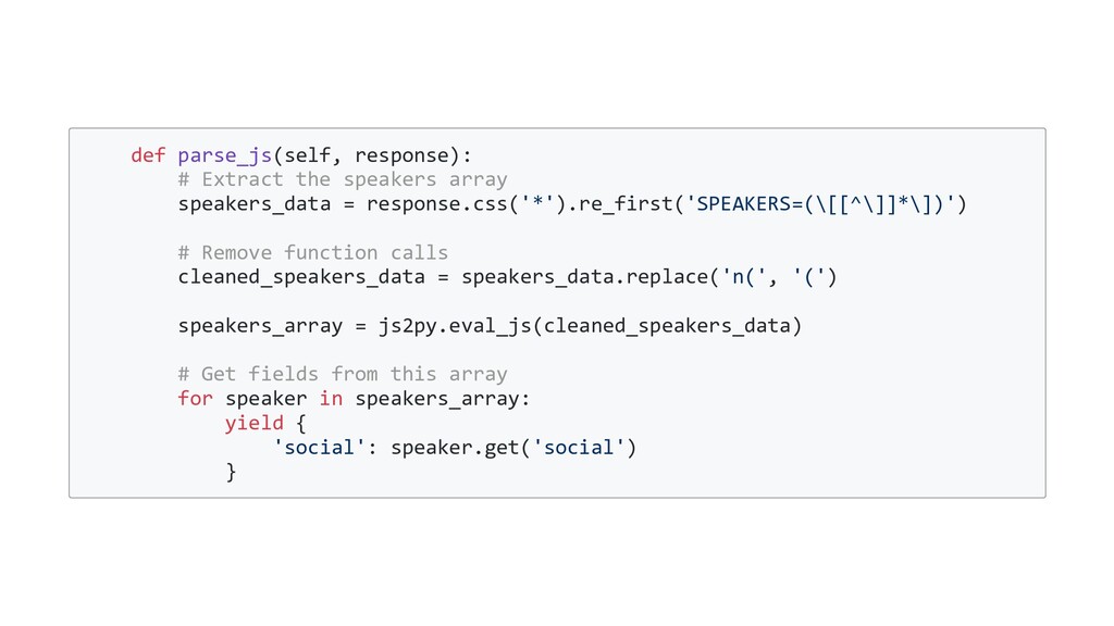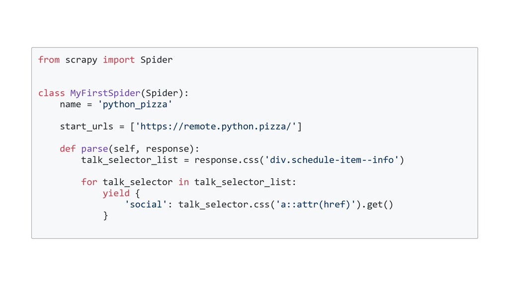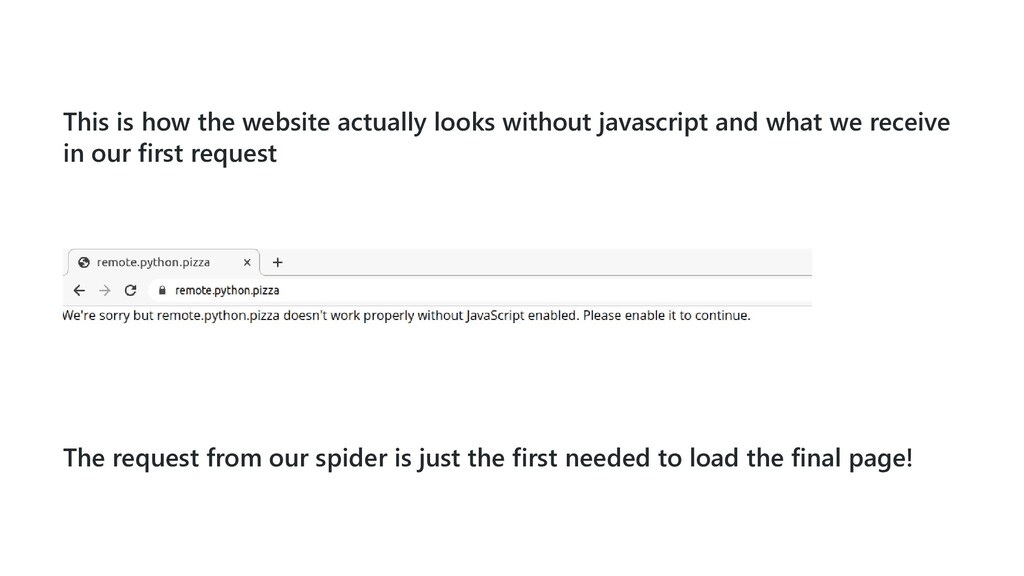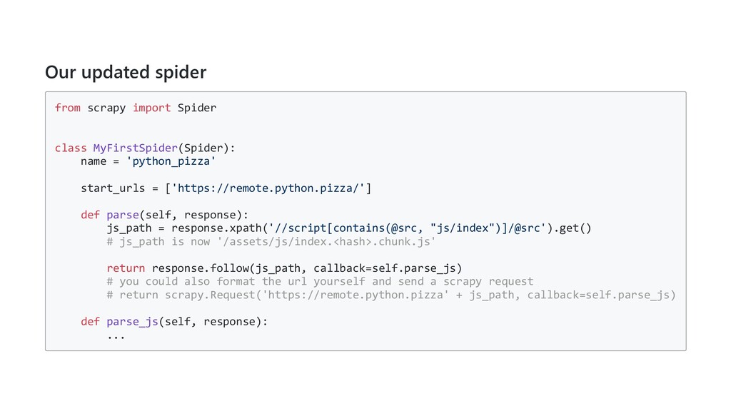 = 'python_pizza' start_urls = ['https://remote.python.pizza/'] def parse(self, response): js_path = response.xpath('//script[contains(@src, "js/index")]/@src').get() # js_path is now '/assets/js/index.<hash>.chunk.js' return response.follow(js_path, callback=self.parse_js) # you could also format the url yourself and send a scrapy request # return scrapy.Request('https://remote.python.pizza' + js_path, callback=self.parse_js) def parse_js(self, response): ...