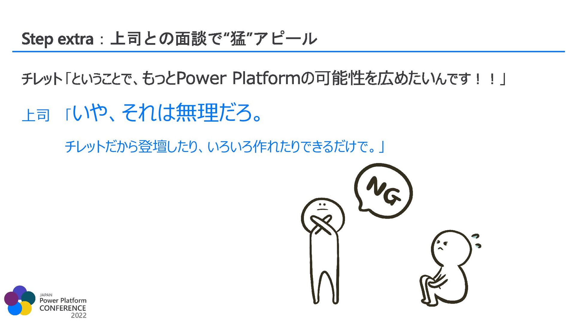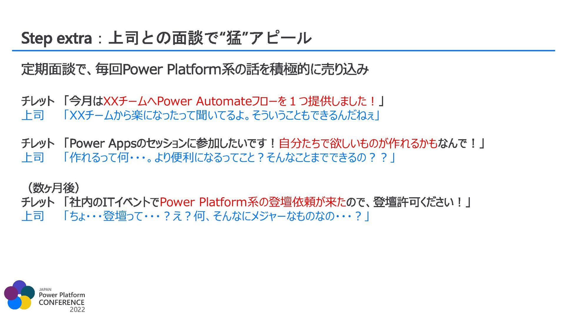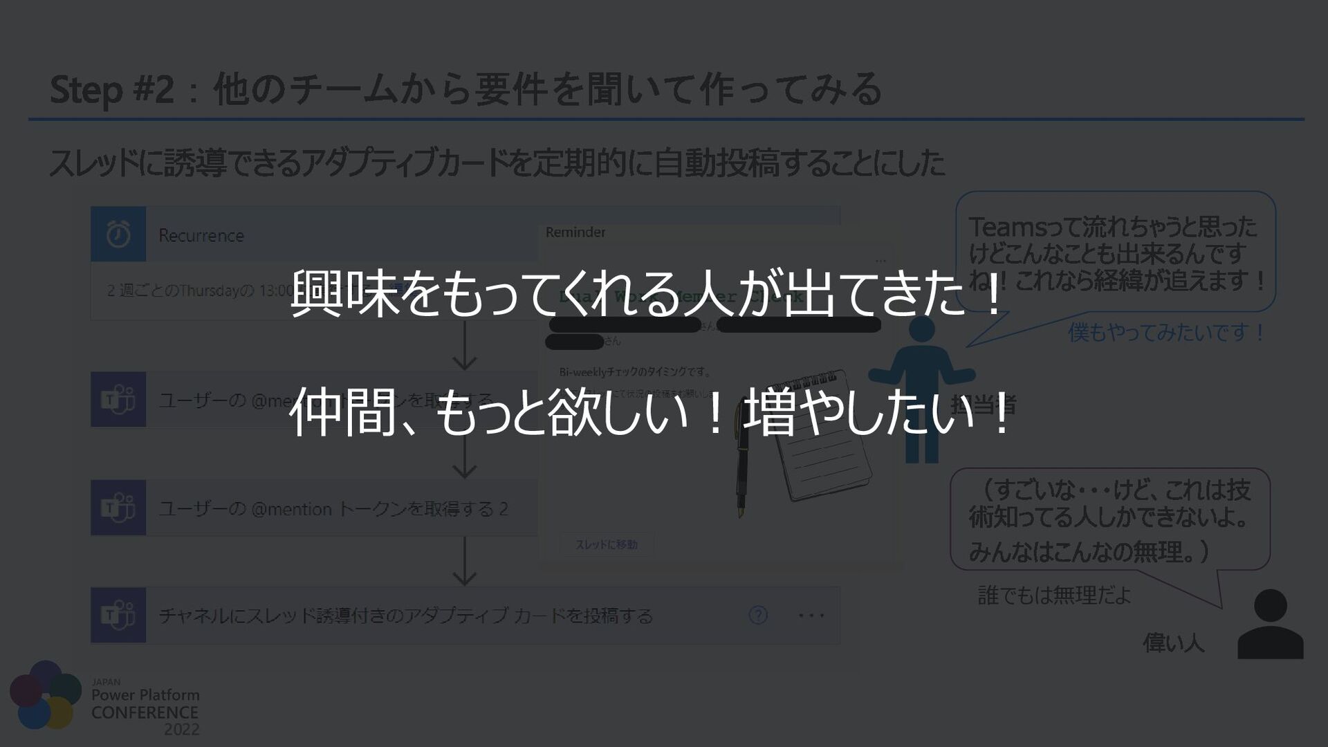 2022 XXチームへPower Automateフローを1つ提供しました! 上司 「XXチームから楽になったって聞いてるよ。そういうこともできるんだねぇ」 自分たちで欲しいものが作れるかも 上司 「作れるって何・・・。より便利になるってこと?そんなことまでできるの??」 Power Platform系の登壇依頼が来た