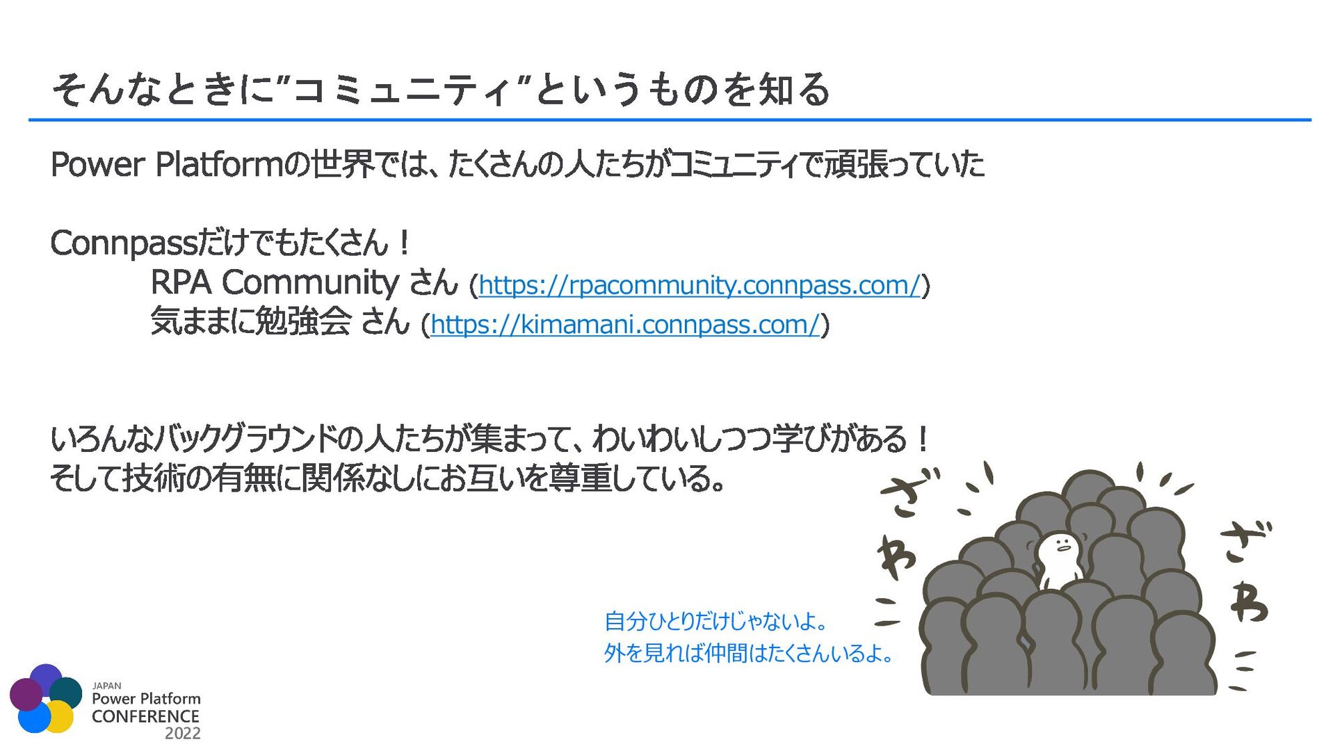 2022 https://rpacommunity.connpass.com/ https://kimamani.connpass.com/ 自分ひとりだけじゃないよ。 外を見れば仲間はたくさんいるよ。