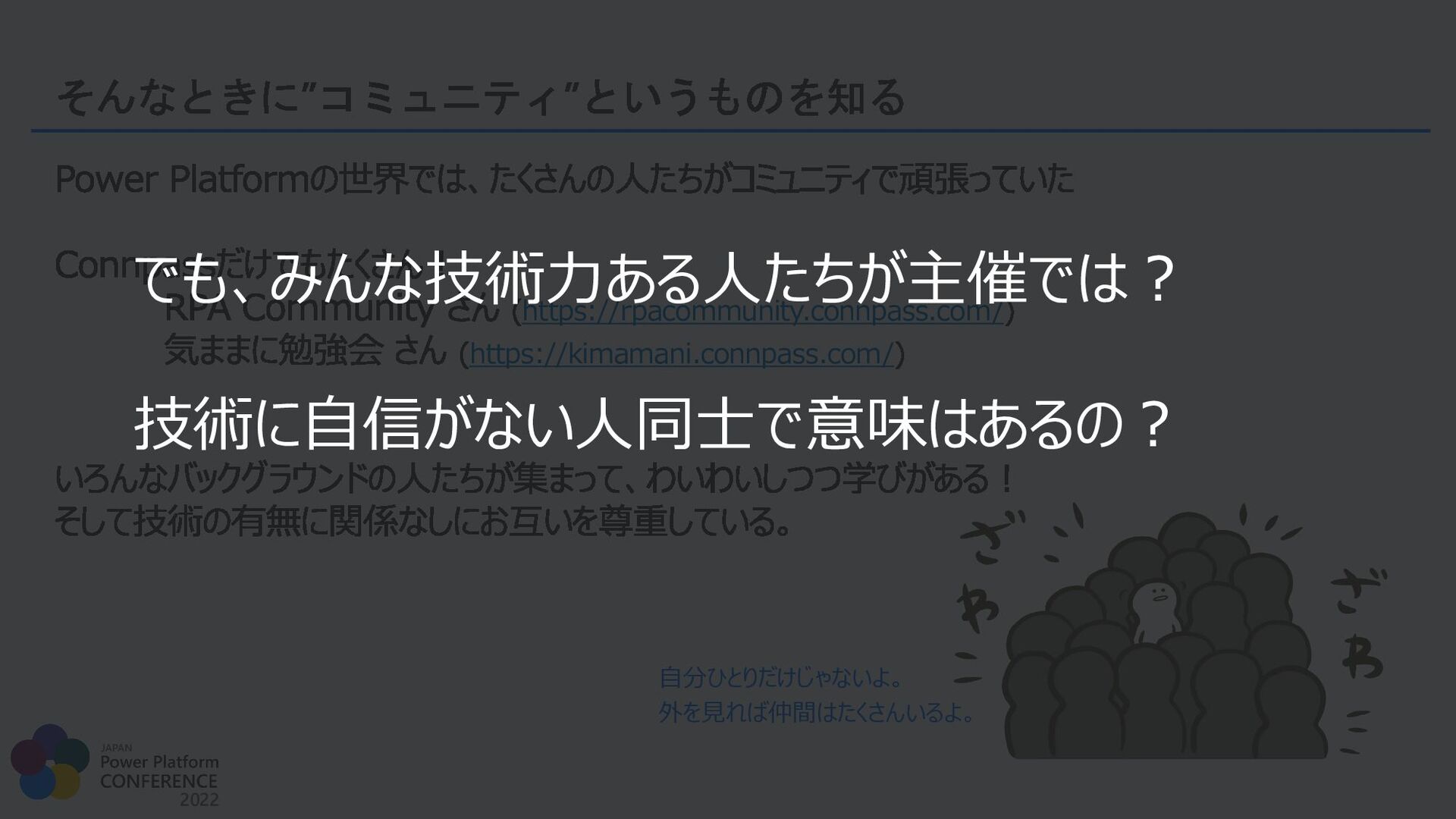 2022 https://rpacommunity.connpass.com/ https://kimamani.connpass.com/ 自分ひとりだけじゃないよ。 外を見れば仲間はたくさんいるよ。 でも、みんな技術力ある人たちが主催では? 技術に自信がない人同士で意味はあるの?