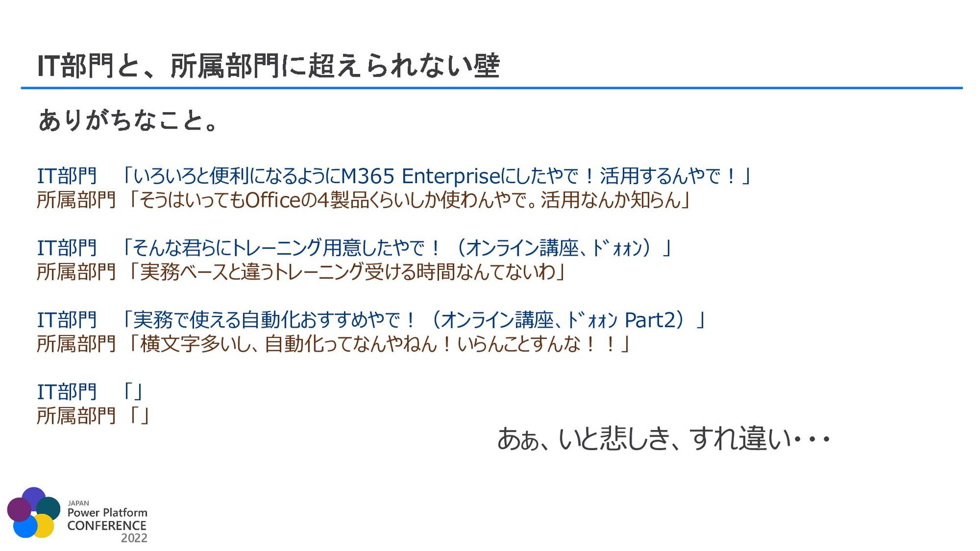 IT部門 「実務で使える自動化おすすめやで!(オンライン講座、ドォォン Part2)」 所属部門 「横文字多いし、自動化ってなんやねん!いらんことすんな!!」 IT部門 「」 所属部門 「」 あぁ、いと悲しき、すれ違い・・・