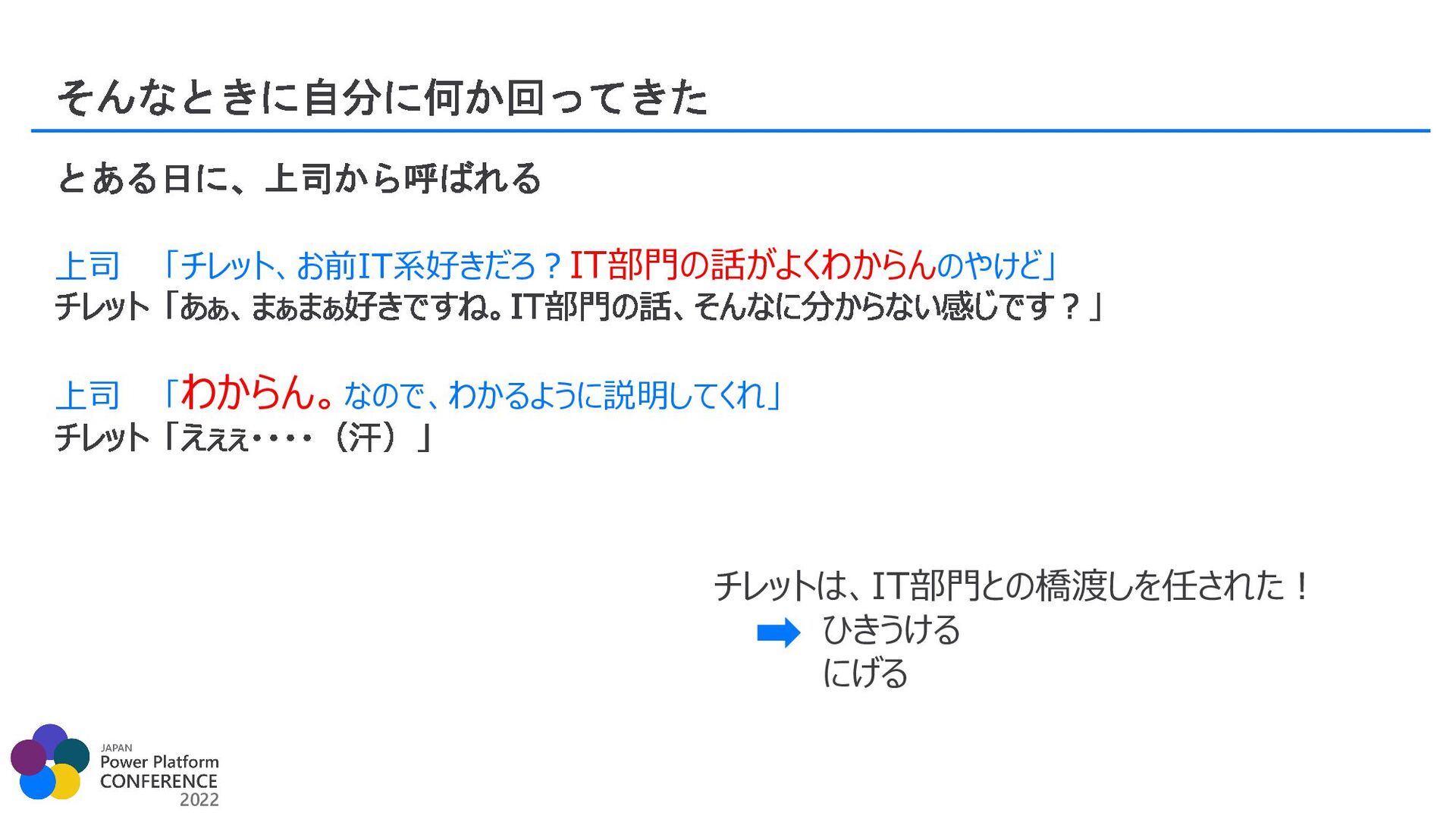 2022 上司 「チレット、お前IT系好きだろ?IT部門の話がよくわからんのやけど」 上司 「わからん。なので、わかるように説明してくれ」 チレットは、IT部門との橋渡しを任された! ひきうける にげる
