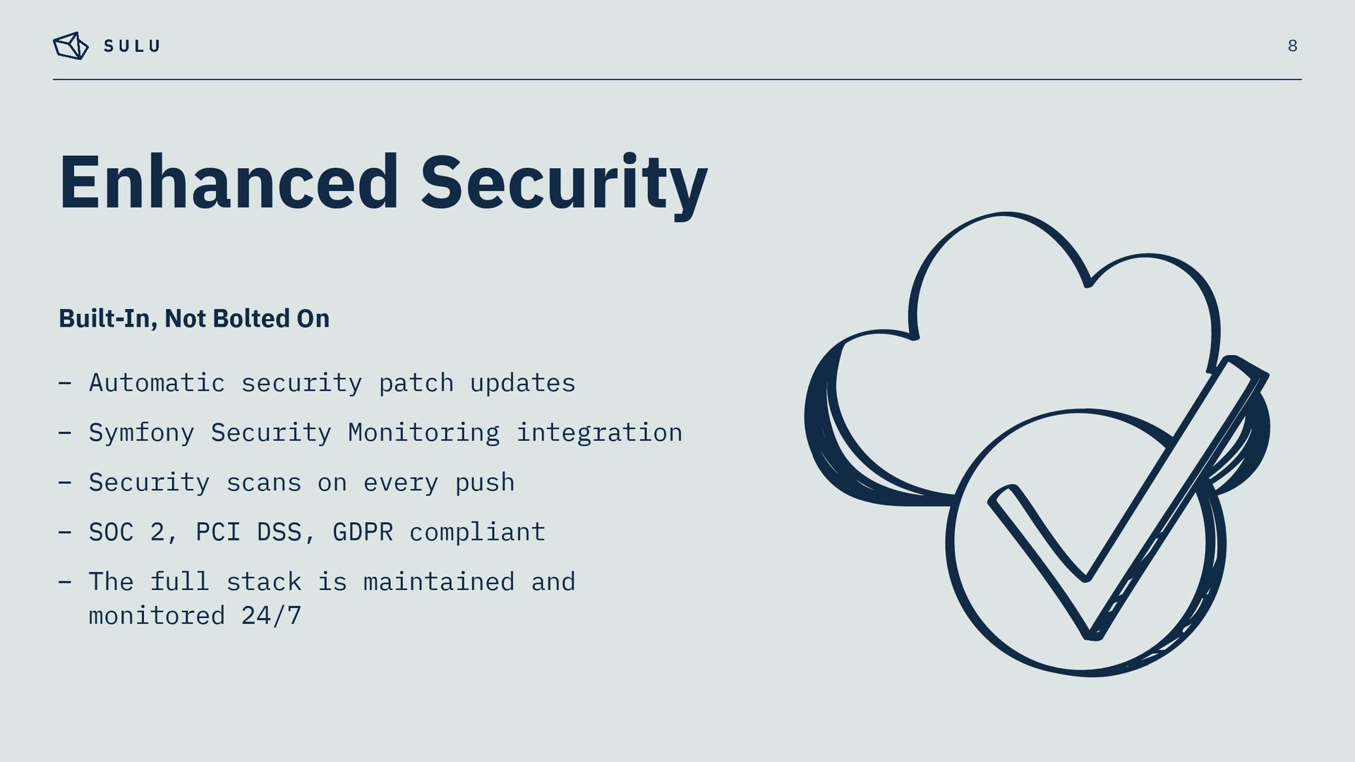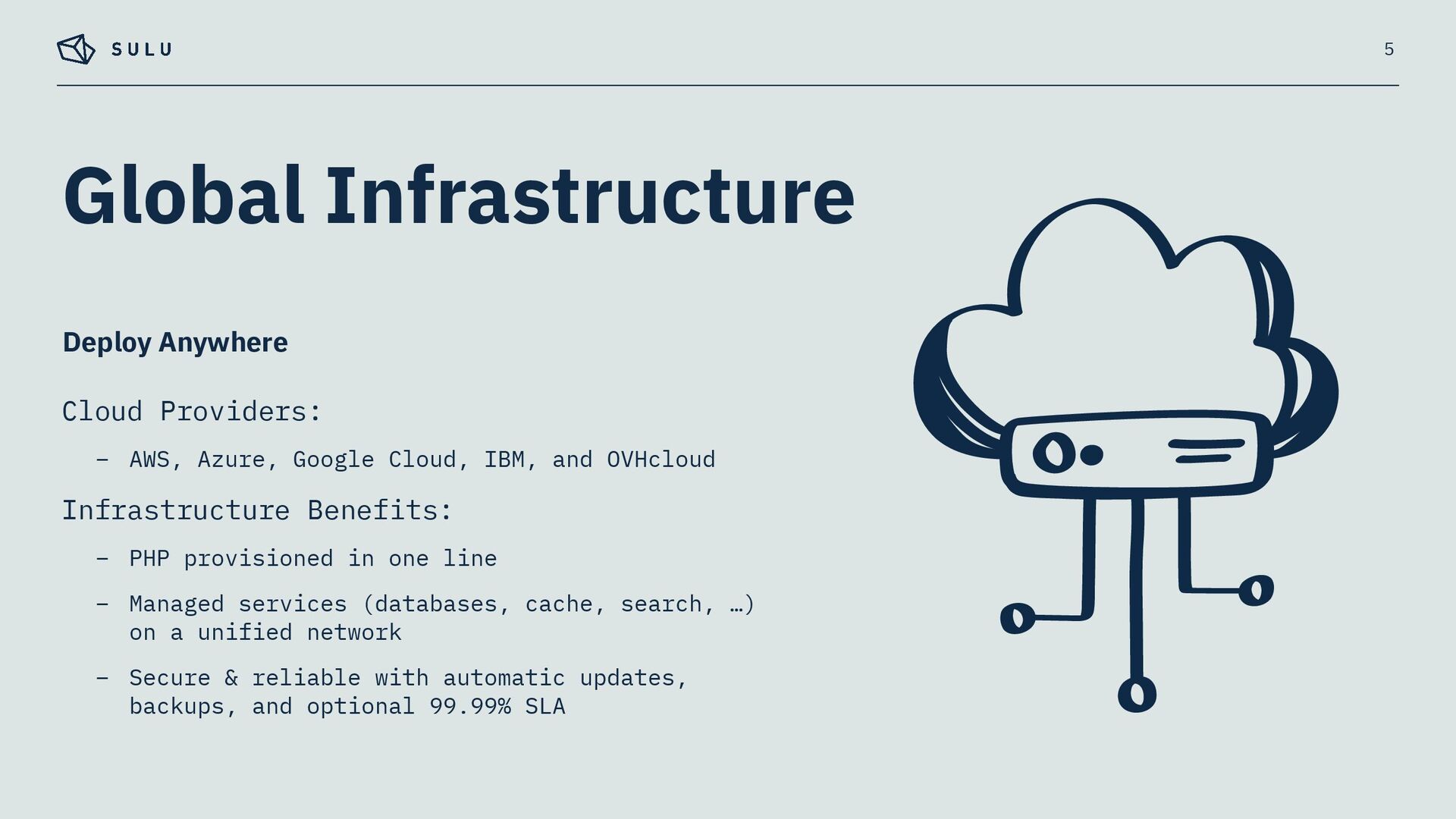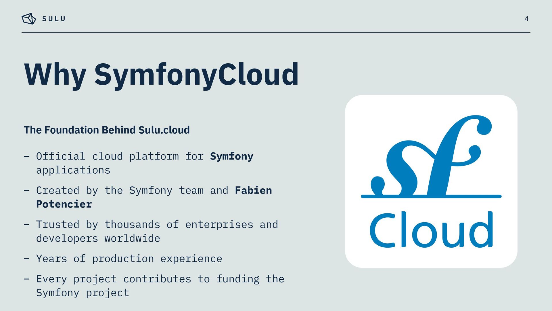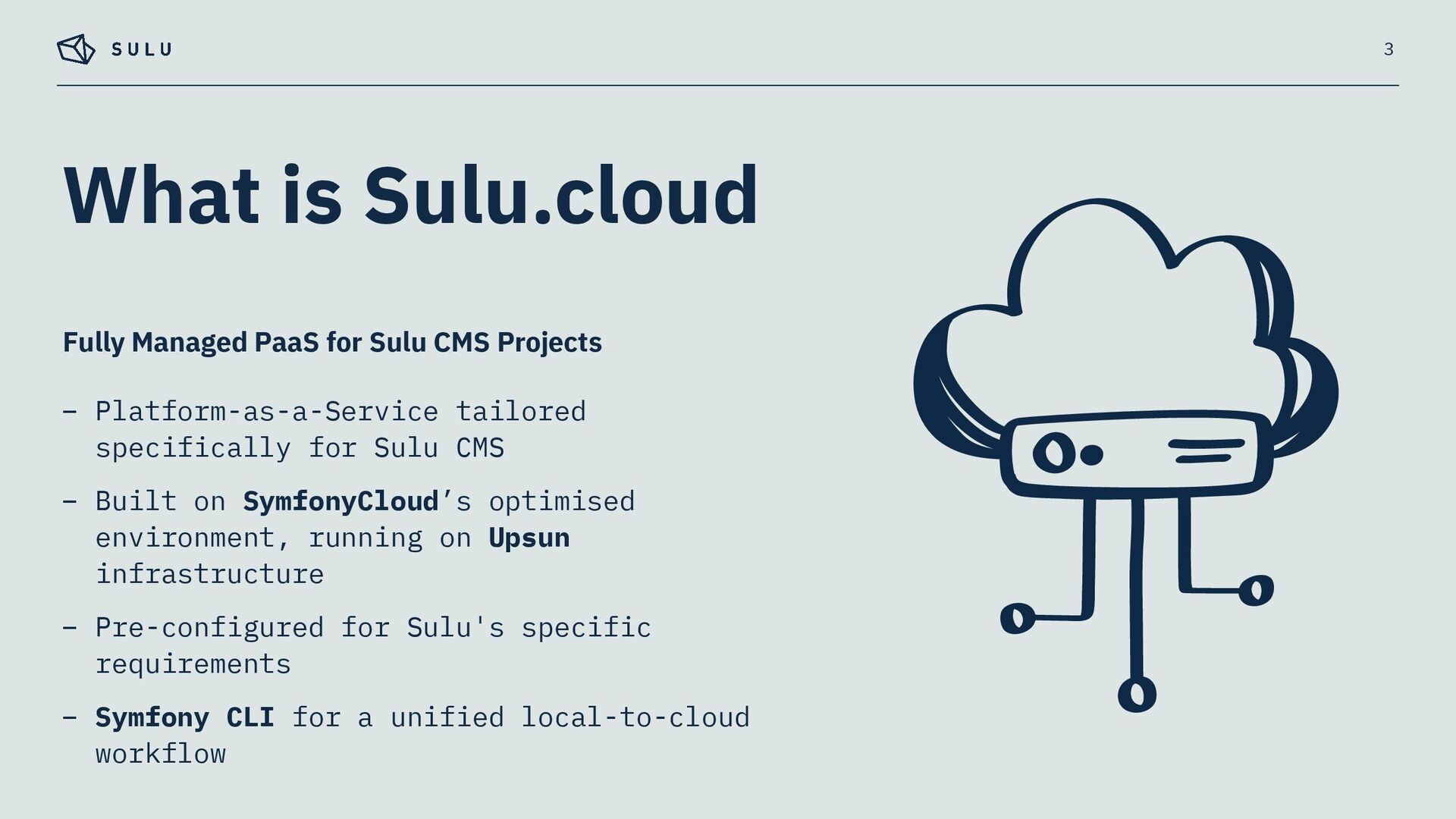 – Built on SymfonyCloud’s optimised environment, running on Upsun infrastructure – Pre-configured for Sulu's specific requirements – Symfony CLI for a unified local-to-cloud workflow 3 Fully Managed PaaS for Sulu CMS Projects