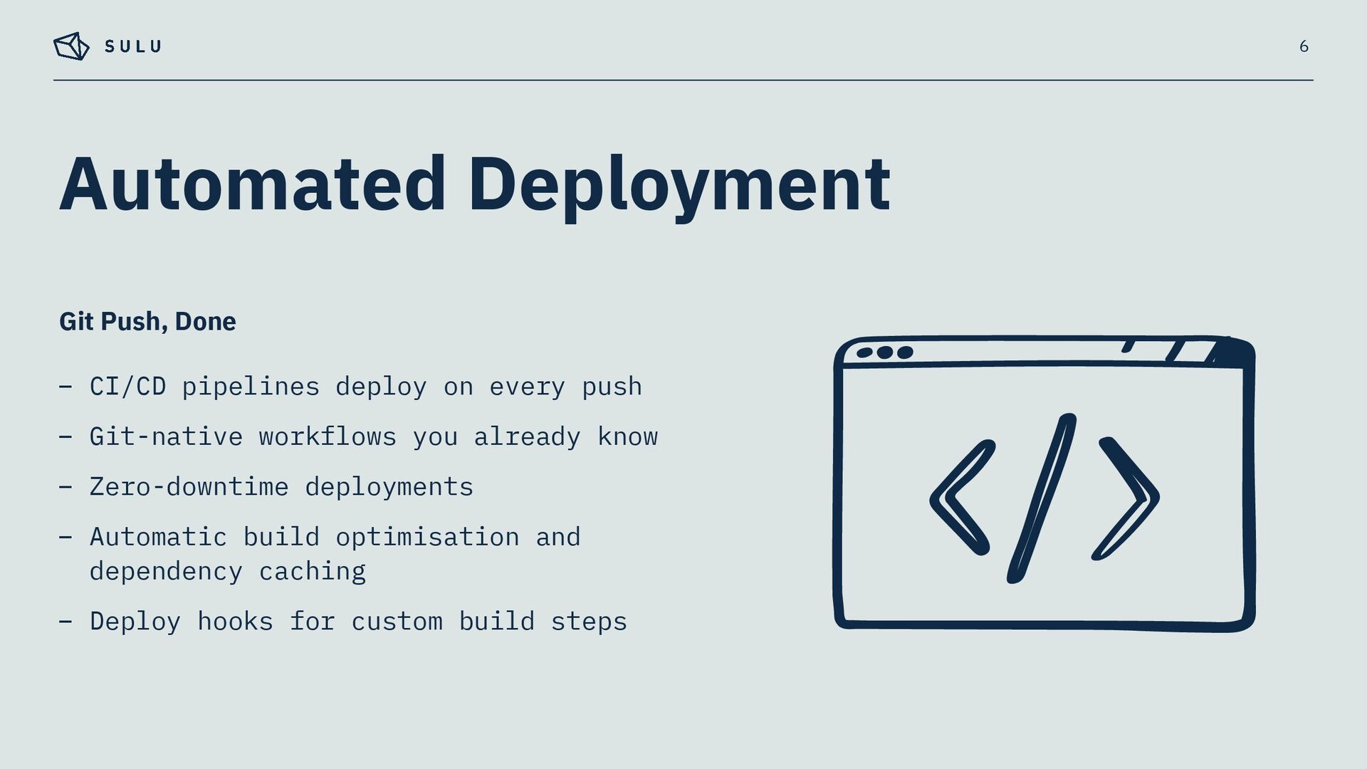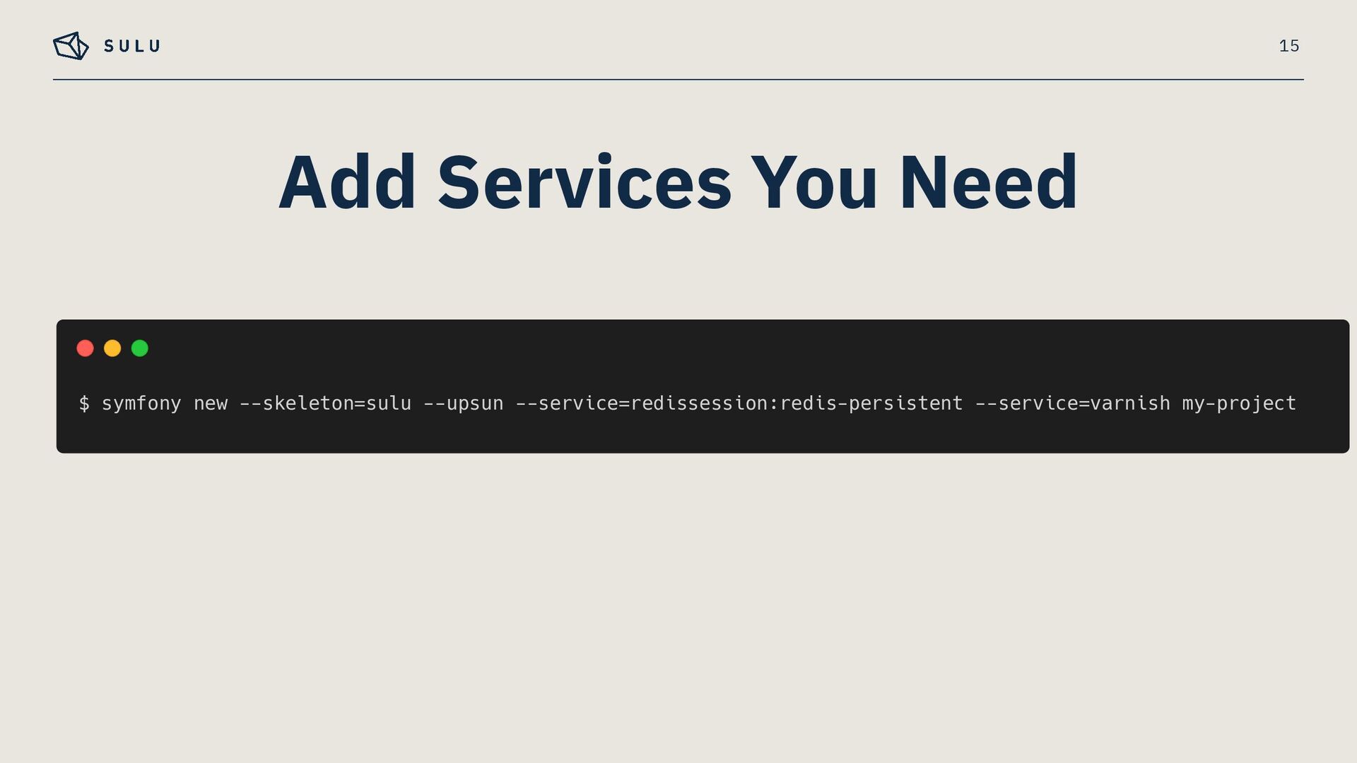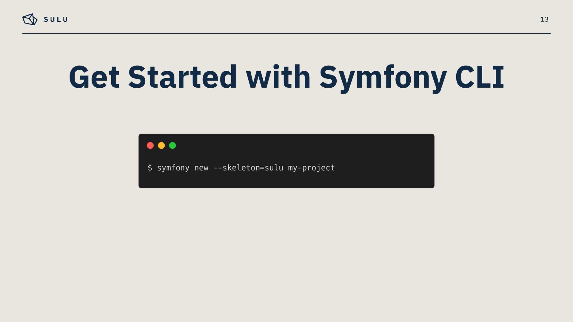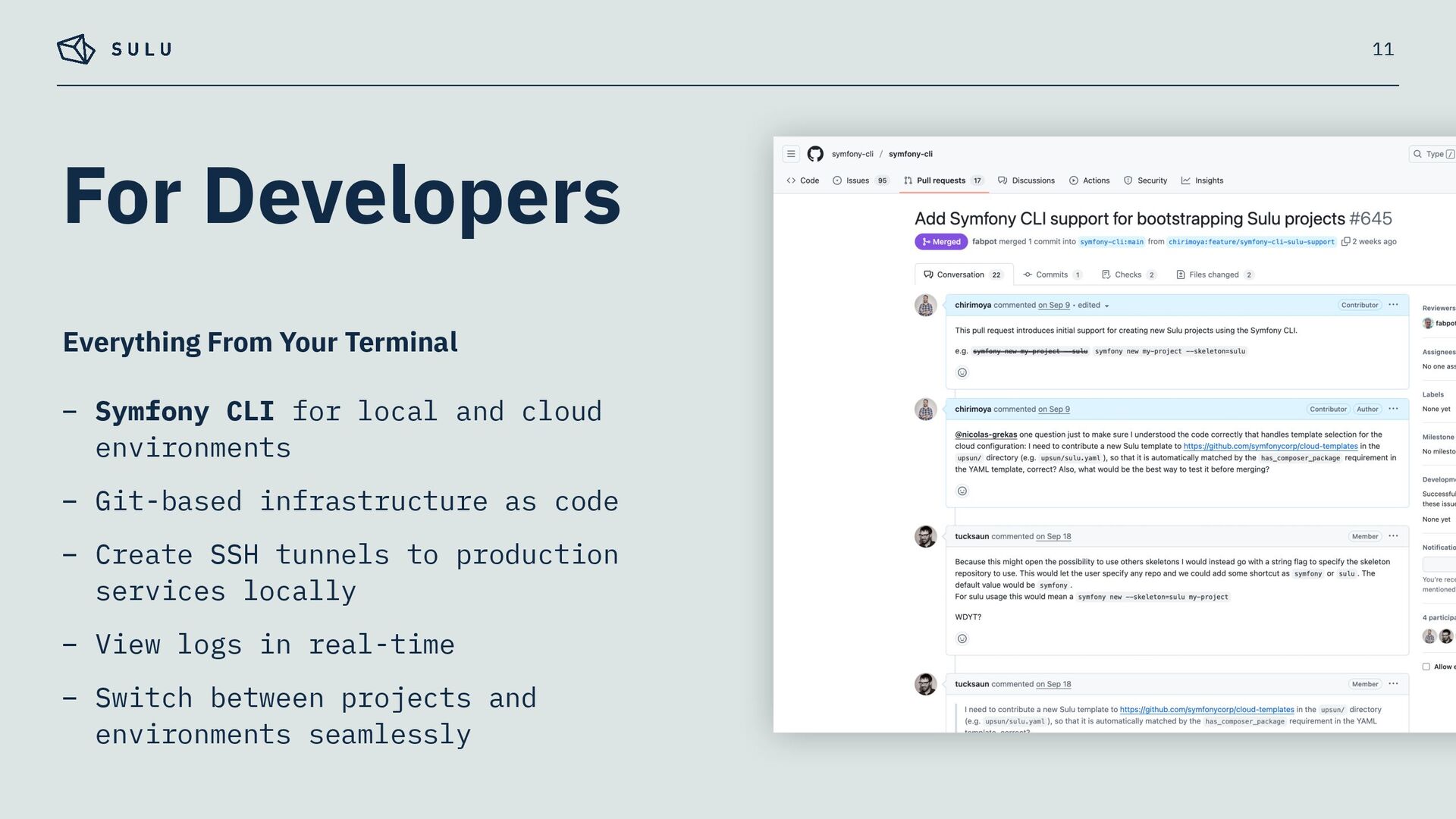 – Built on SymfonyCloud’s optimised environment, running on Upsun infrastructure – Pre-configured for Sulu's specific requirements – Symfony CLI for a unified local-to-cloud workflow 3 Fully Managed PaaS for Sulu CMS Projects