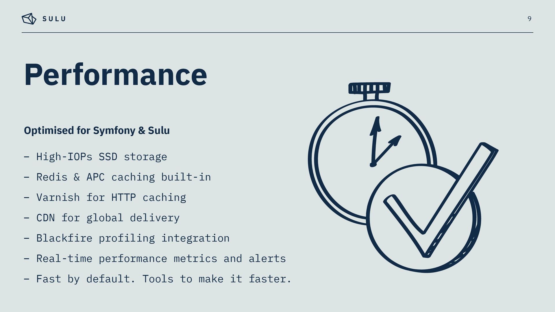 built-in – Varnish for HTTP caching – CDN for global delivery – Blackfire profiling integration – Real-time performance metrics and alerts – Fast by default. Tools to make it faster. 9 Optimised for Symfony & Sulu
