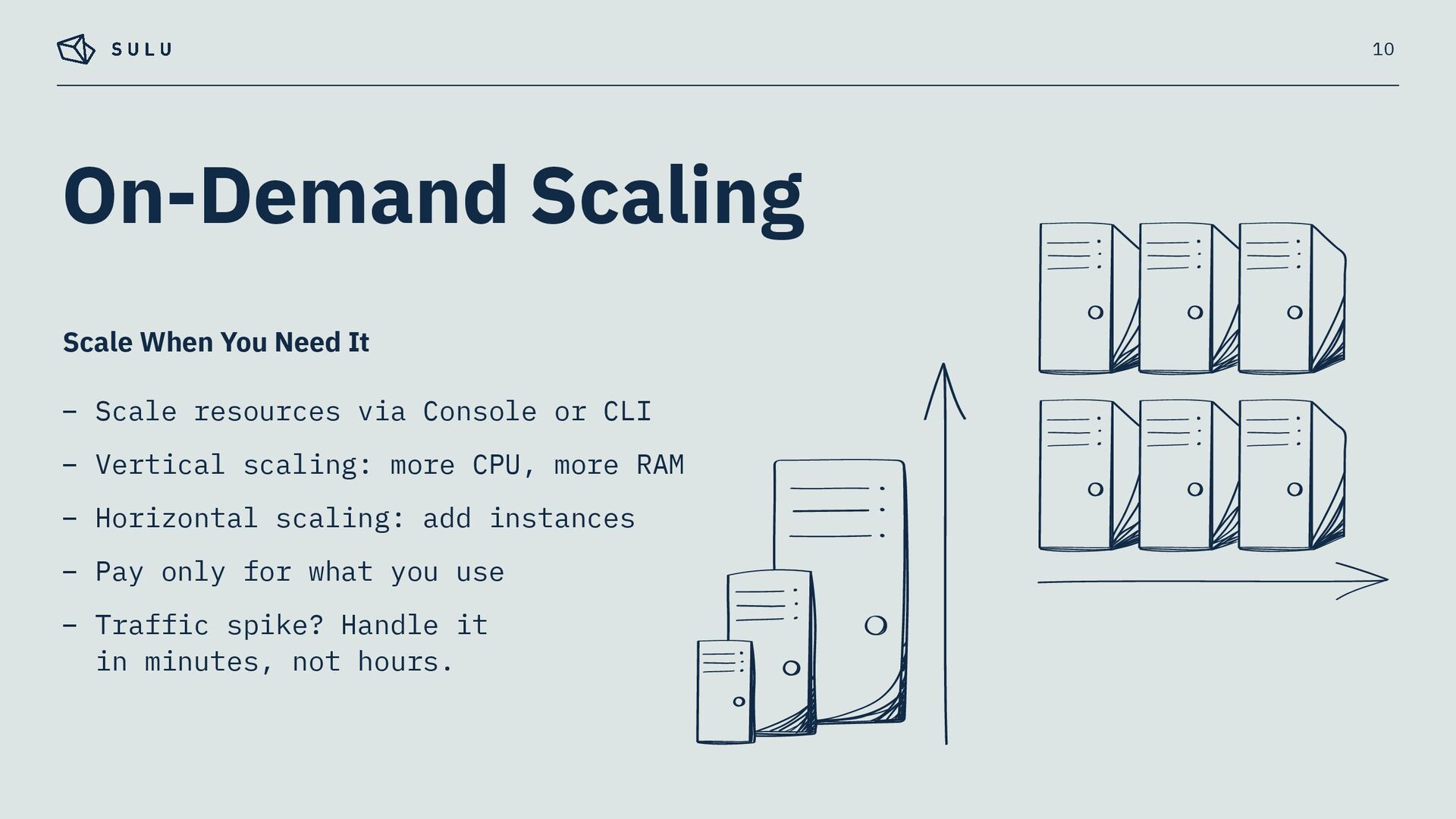 Vertical scaling: more CPU, more RAM – Horizontal scaling: add instances – Pay only for what you use – Traffic spike? Handle it in minutes, not hours. 10 Scale When You Need It
