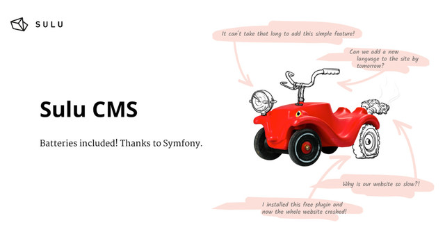 crashed! It can´t take that long to add this simple feature! Why is our website so slow?! Can we add a new language to the site by tomorrow? Sulu CMS Batteries included! Thanks to Symfony.