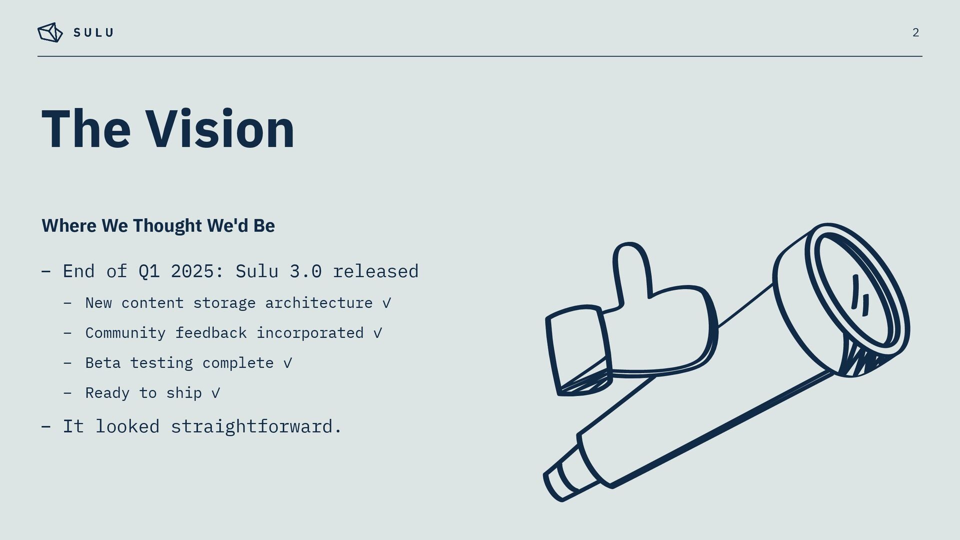 – New content storage architecture ✓ – Community feedback incorporated ✓ – Beta testing complete ✓ – Ready to ship ✓ – It looked straightforward. 2 Where We Thought We'd Be