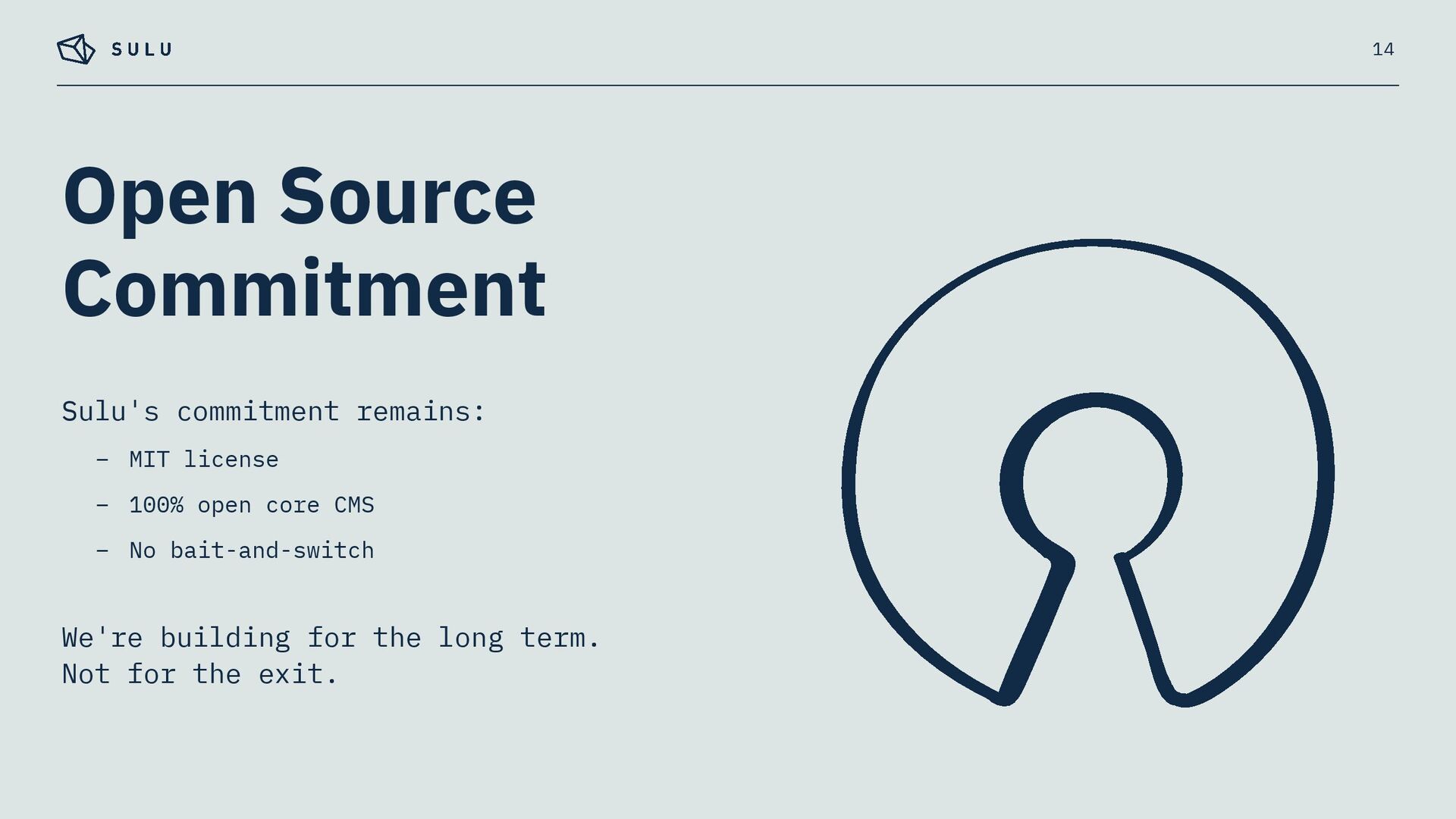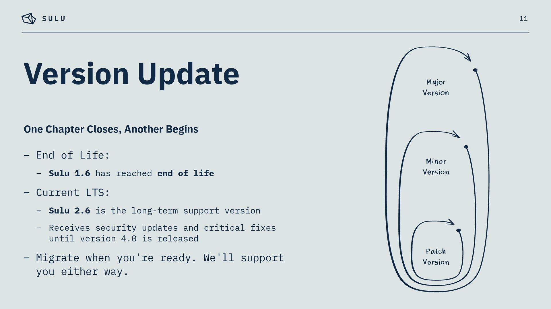 reached end of life – Current LTS: – Sulu 2.6 is the long-term support version – Receives security updates and critical fixes until version 4.0 is released – Migrate when you're ready. We'll support you either way. 11 One Chapter Closes, Another Begins
