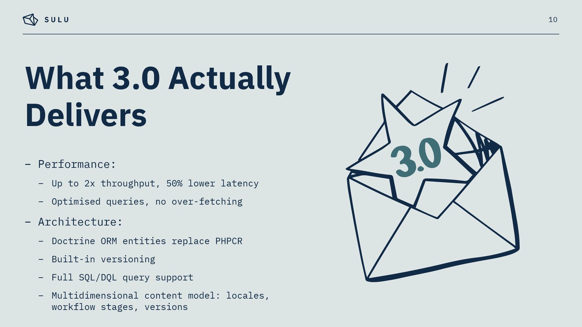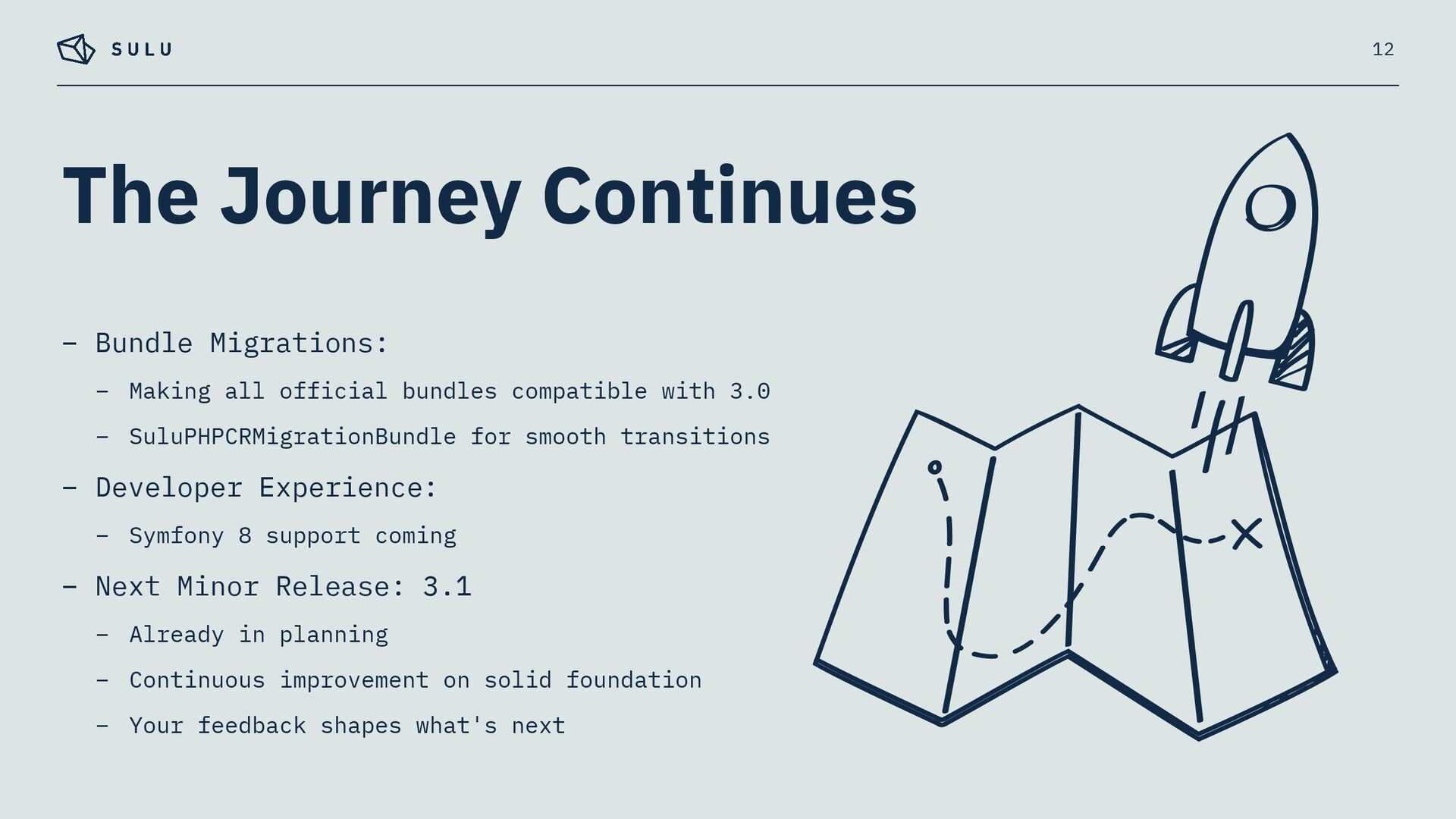 bundles compatible with 3.0 – SuluPHPCRMigrationBundle for smooth transitions – Developer Experience: – Symfony 8 support coming – Next Minor Release: 3.1 – Already in planning – Continuous improvement on solid foundation – Your feedback shapes what's next 12