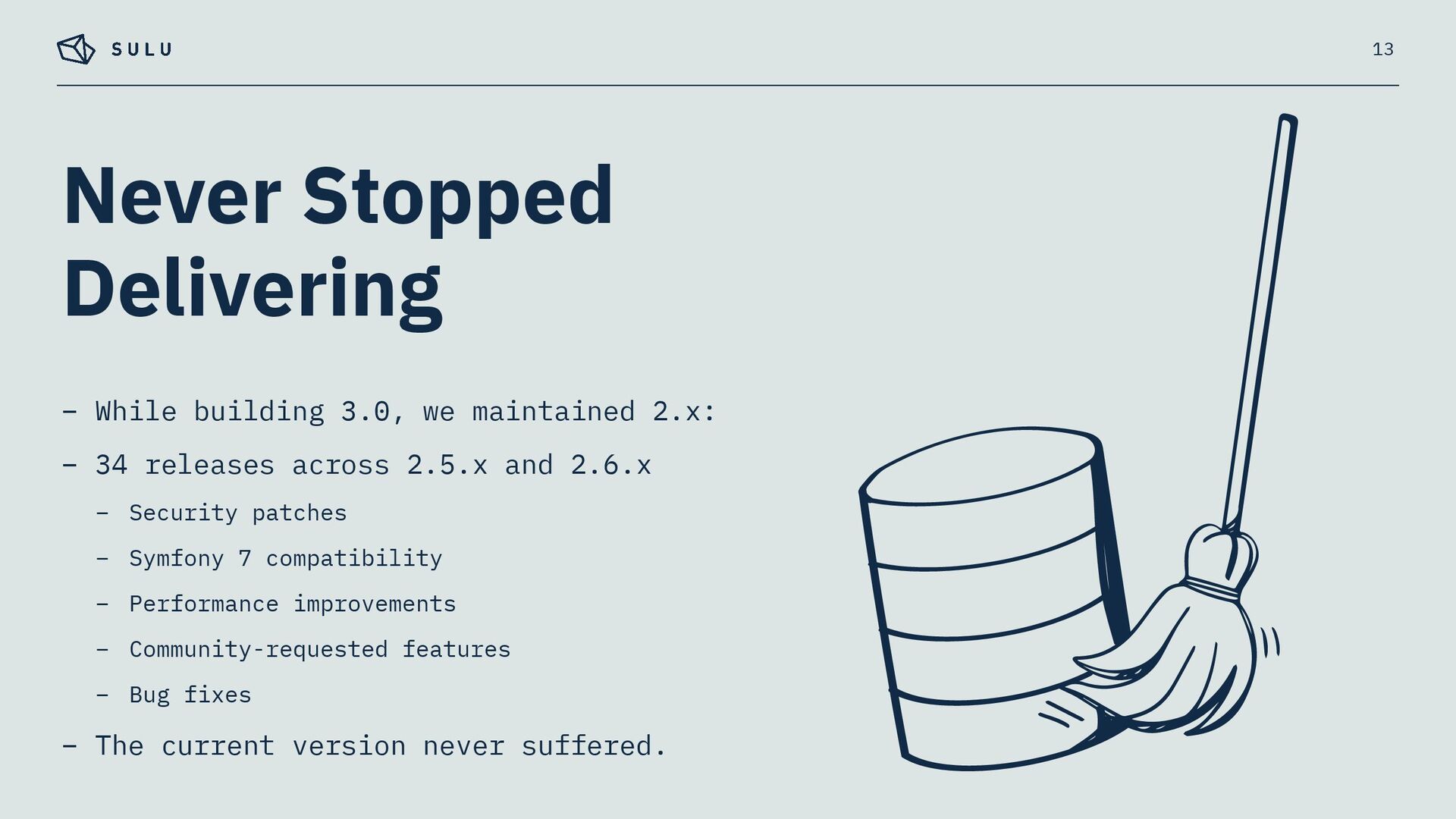 – 34 releases across 2.5.x and 2.6.x – Security patches – Symfony 7 compatibility – Performance improvements – Community-requested features – Bug fixes – The current version never suffered. 13