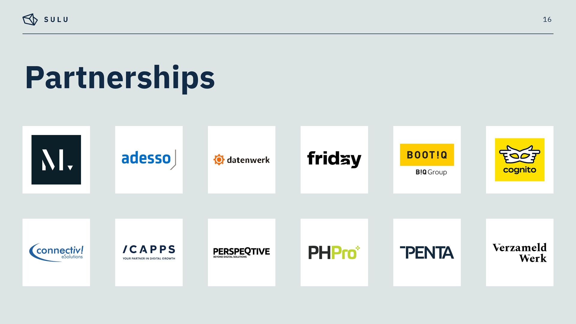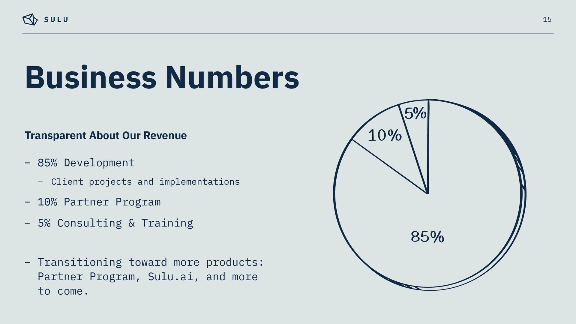 – 10% Partner Program – 5% Consulting & Training – Transitioning toward more products: Partner Program, Sulu.ai, and more to come. 15 Transparent About Our Revenue