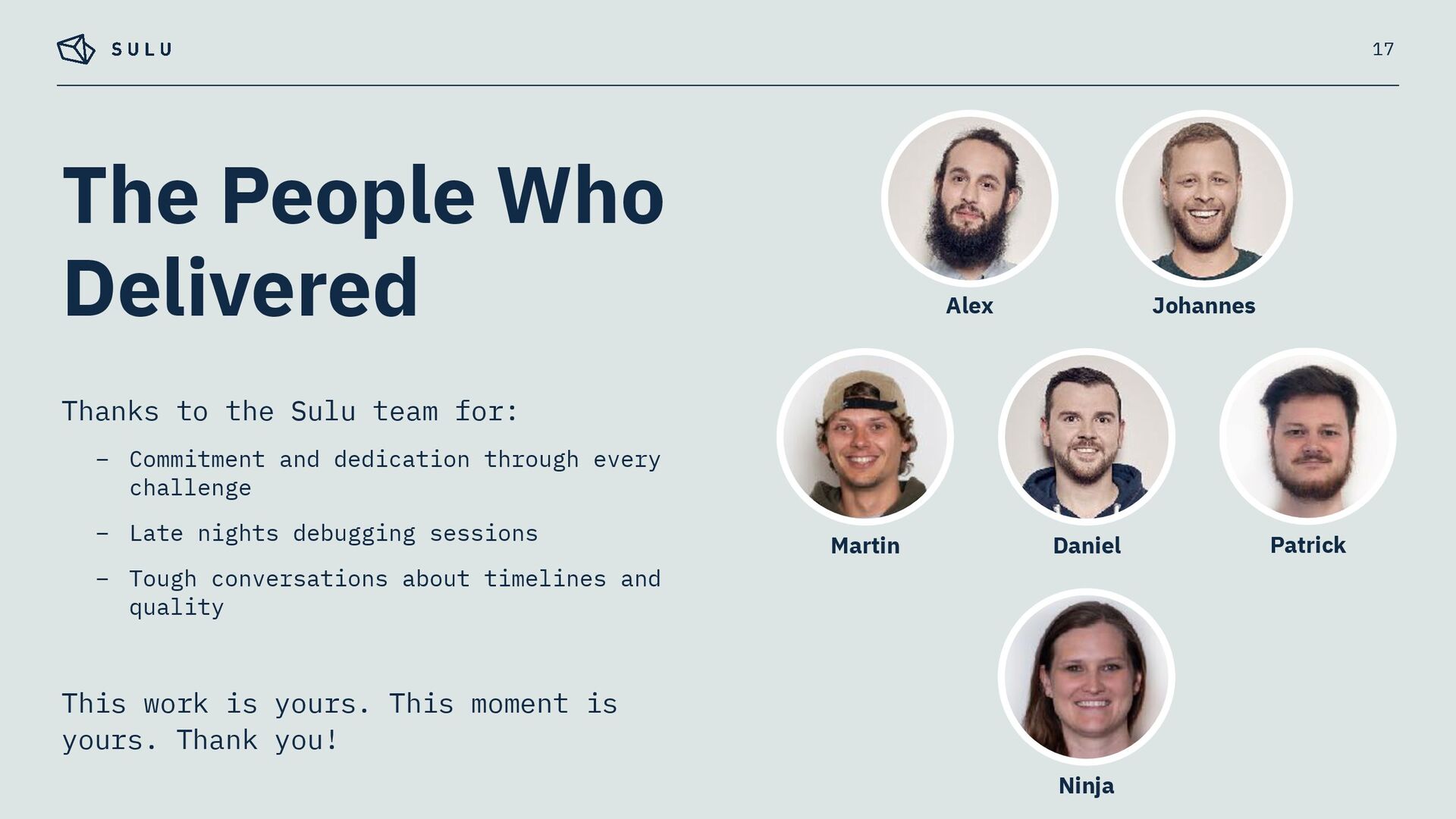 for: – Commitment and dedication through every challenge – Late nights debugging sessions – Tough conversations about timelines and quality This work is yours. This moment is yours. Thank you! Alex Johannes Martin Daniel Patrick Ninja