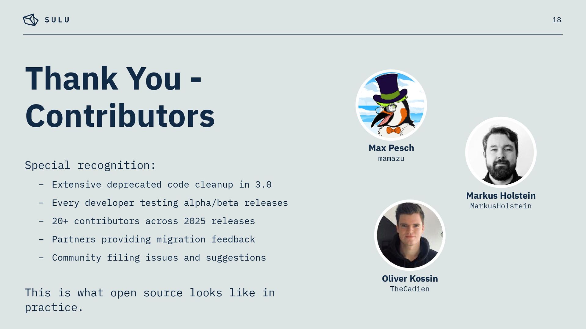 cleanup in 3.0 – Every developer testing alpha/beta releases – 20+ contributors across 2025 releases – Partners providing migration feedback – Community filing issues and suggestions This is what open source looks like in practice. 18 Oliver Kossin TheCadien Markus Holstein MarkusHolstein Max Pesch mamazu