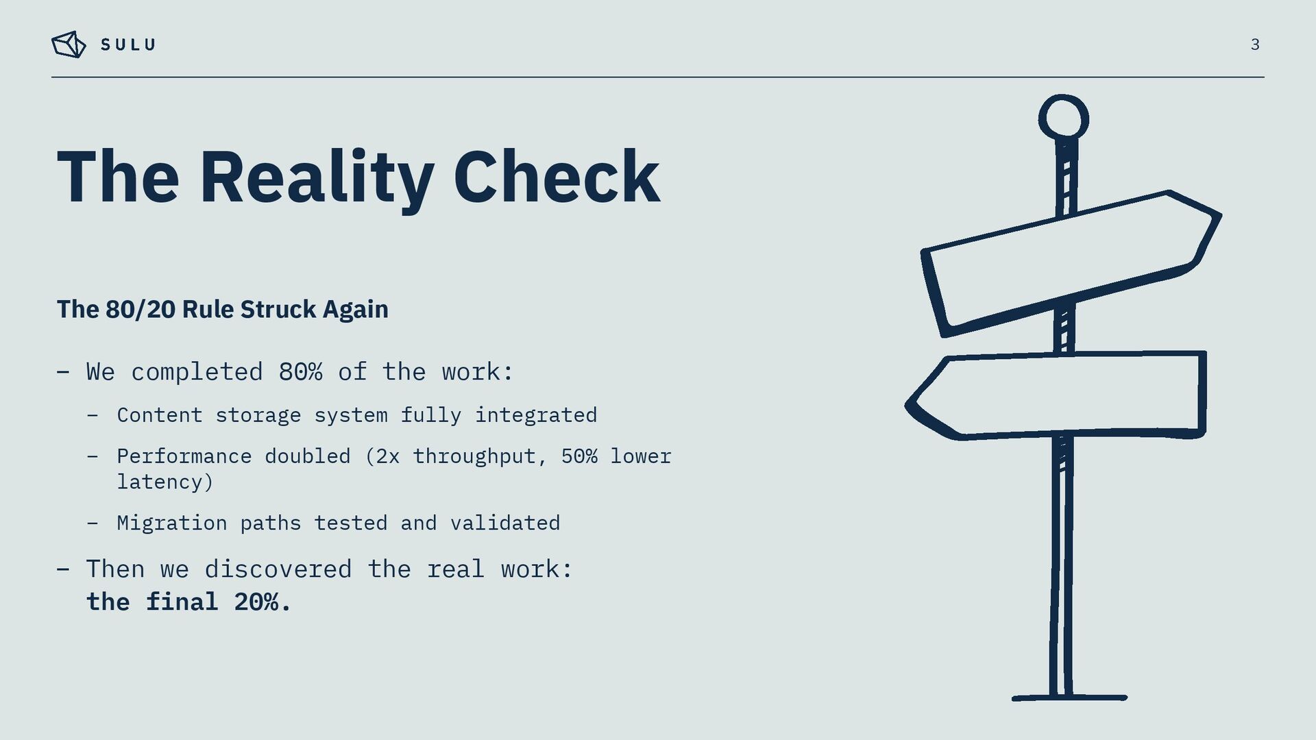 – Content storage system fully integrated – Performance doubled (2x throughput, 50% lower latency) – Migration paths tested and validated – Then we discovered the real work: the final 20%. 3 The 80/20 Rule Struck Again