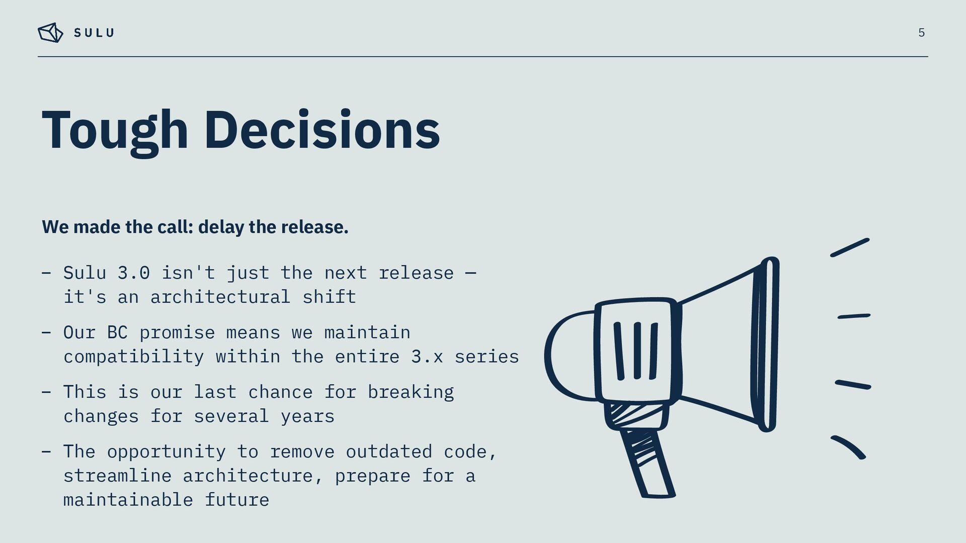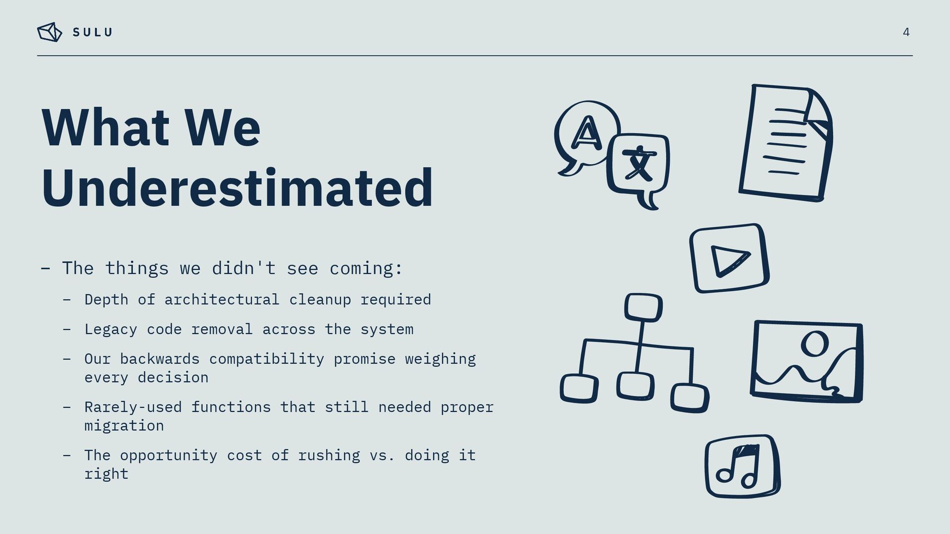 – Depth of architectural cleanup required – Legacy code removal across the system – Our backwards compatibility promise weighing every decision – Rarely-used functions that still needed proper migration – The opportunity cost of rushing vs. doing it right 4