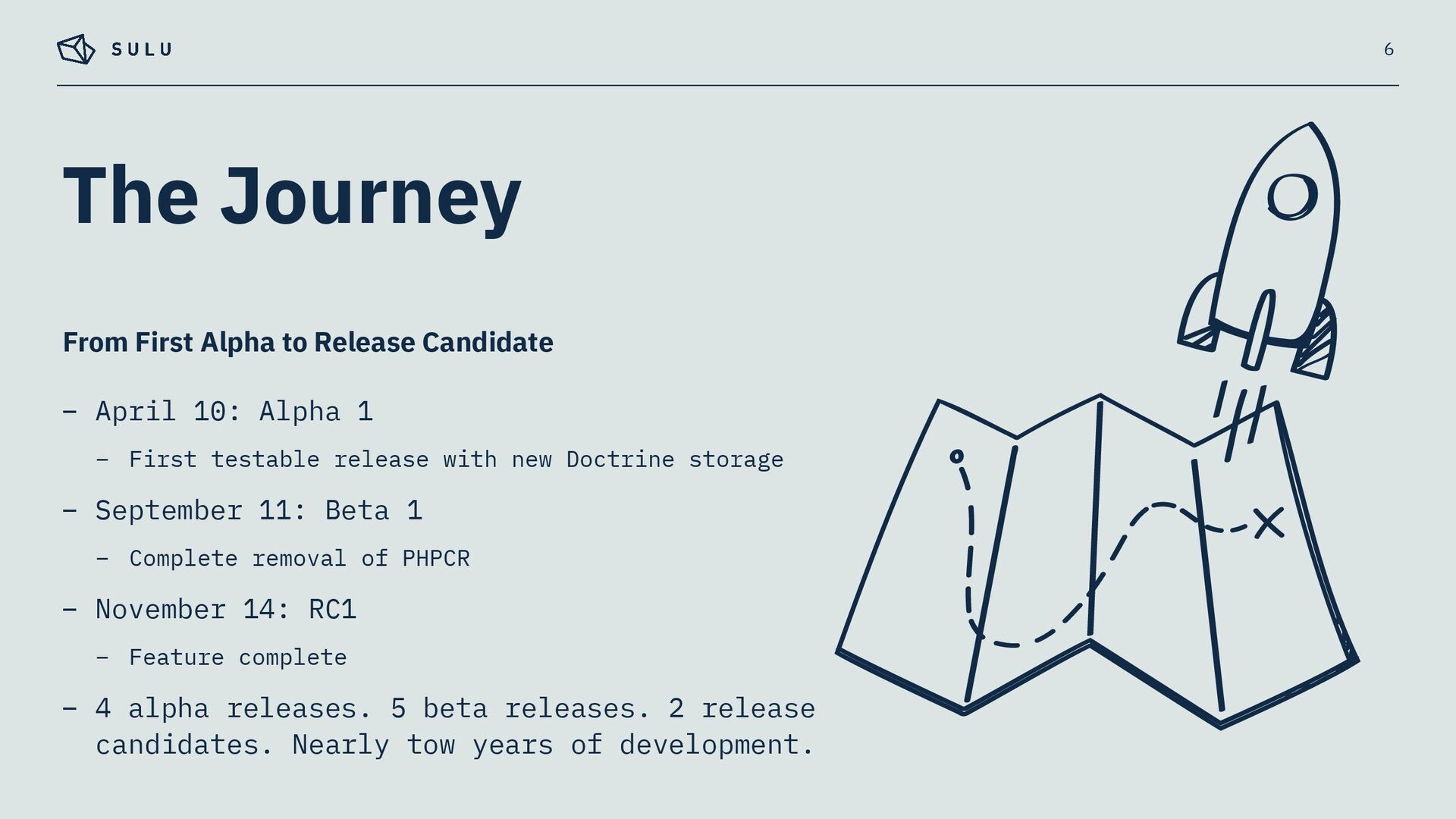 release with new Doctrine storage – September 11: Beta 1 – Complete removal of PHPCR – November 14: RC1 – Feature complete – 4 alpha releases. 5 beta releases. 2 release candidates. Nearly tow years of development. 6 From First Alpha to Release Candidate